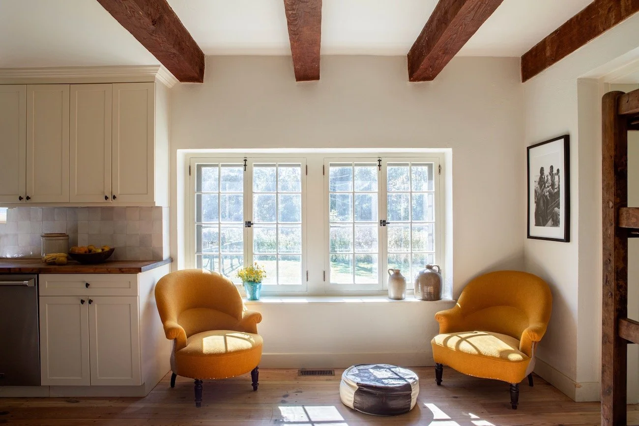 The living room has deep comfortable seating and a grand stone fireplace. The bedrooms are generously proportioned and furnished with inviting and comfortable furnishings. The light-filled office has a sizable desk and space to meet and work. The newly renovated master bathroom has a double-sized sink and a soaking tub. The kitchen, outfitted with top quality appliances, has Siberian elm kitchen counters that sit below a backsplash made from gorgeous Cle tiles, and an unlacquered brass Barber Wilson faucet graces the sink. Light streams through the original paned windows that each frame a tree and open like classic French doors.