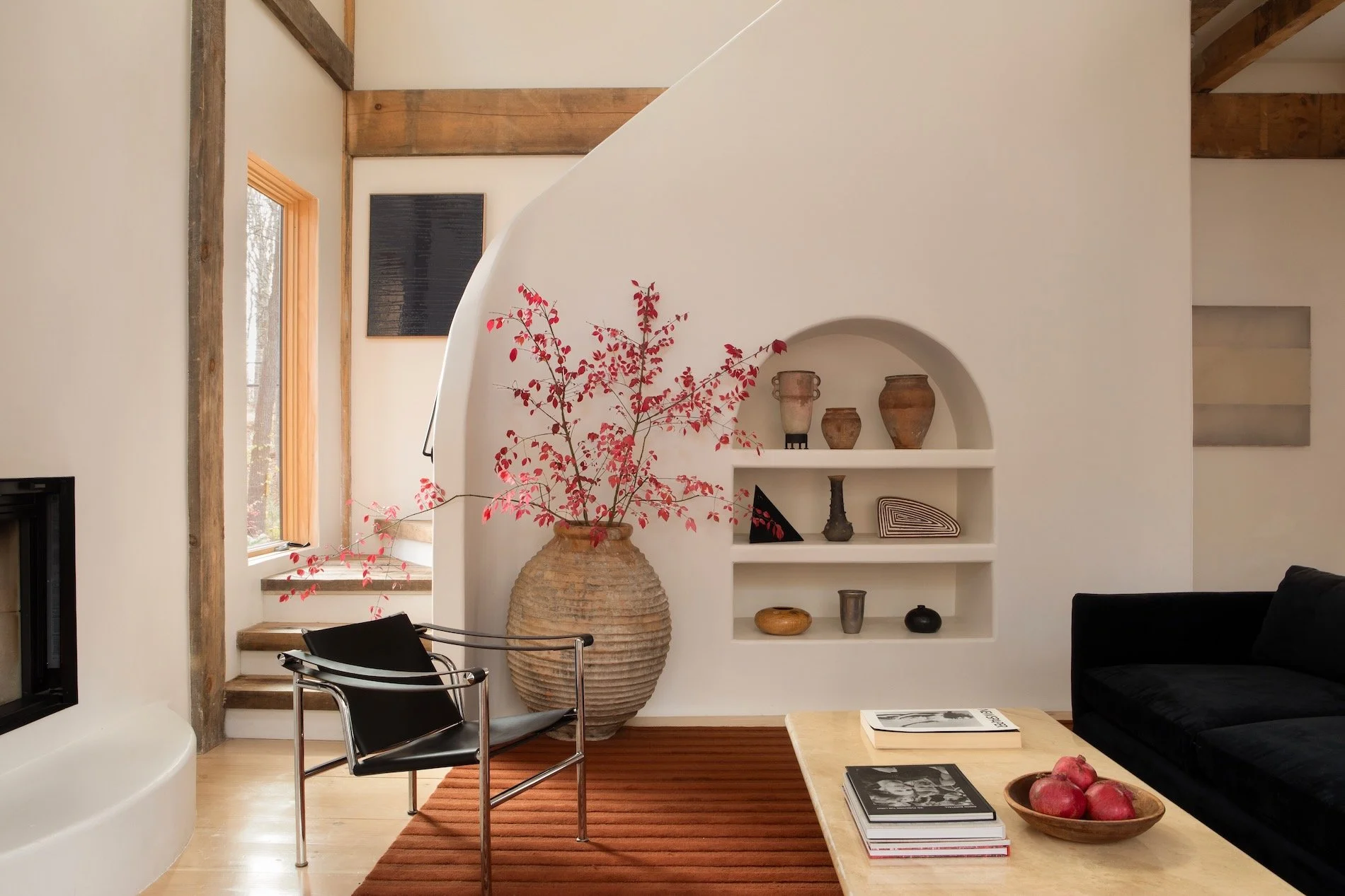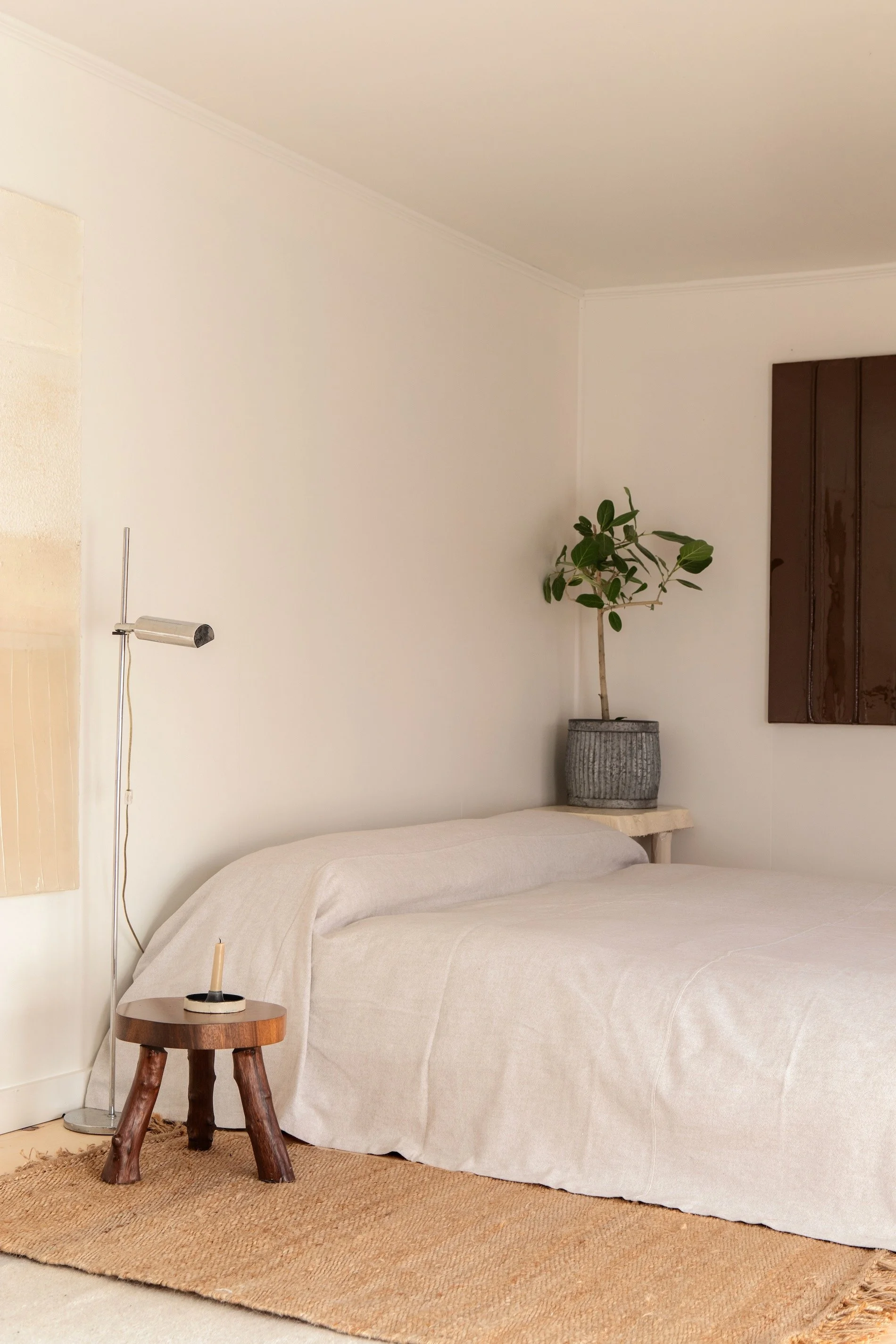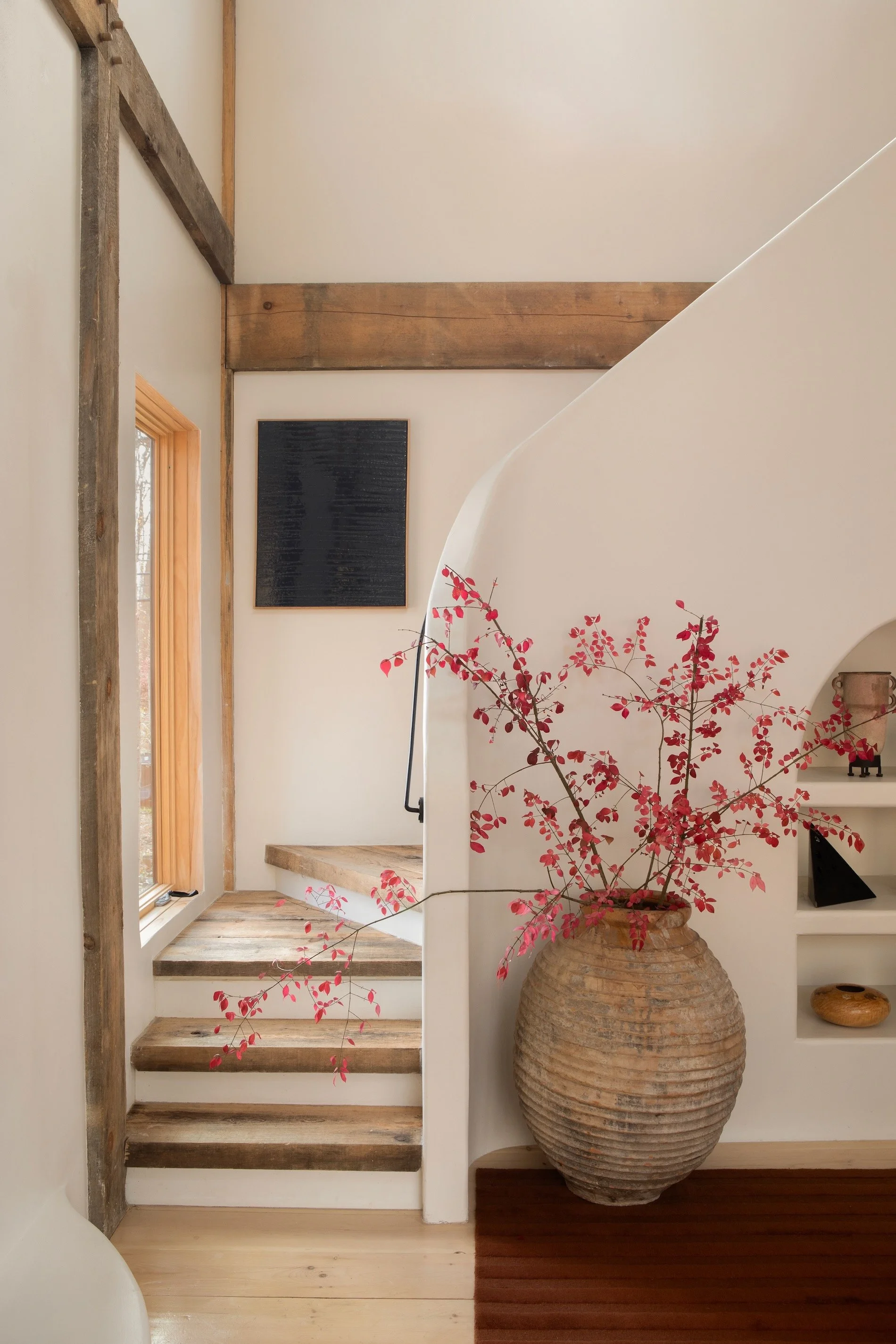 Winding up the staircase to the second floor, you'll reach the wide landing, perfect for use as overflow living space or a media room. The guest bedroom is cozy and bright, and the primary suite is abundantly peaceful with idyllic, sweeping views of the property. The bathroom is carefully pared back in palette, with creamy-colored reclaimed French limestone floors, a Viola marble sink, and a handcrafted Moroccan Tadelakt wall and shower finish.