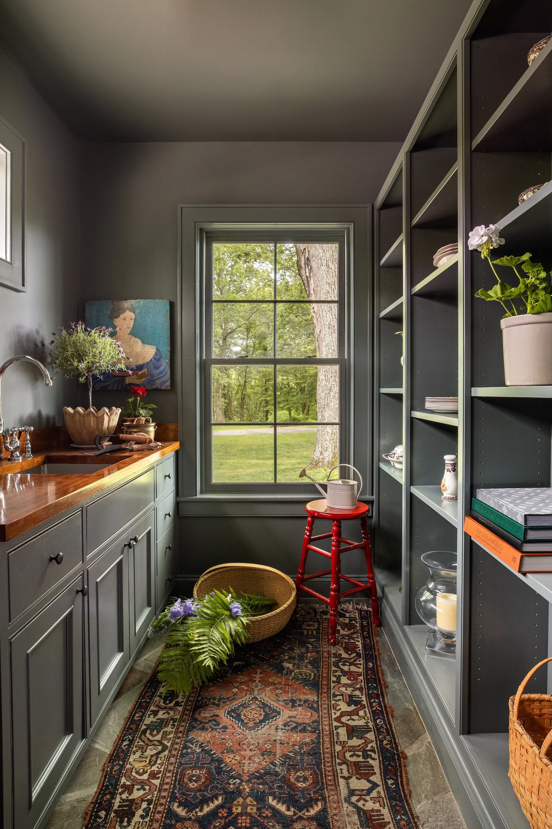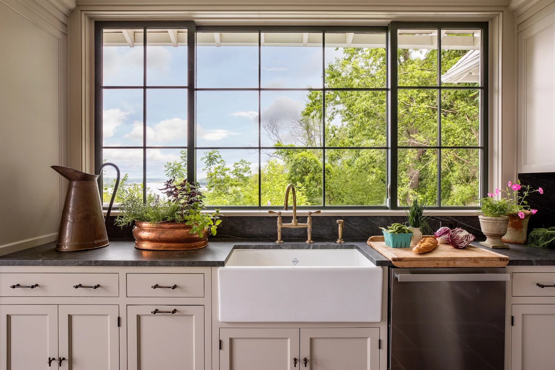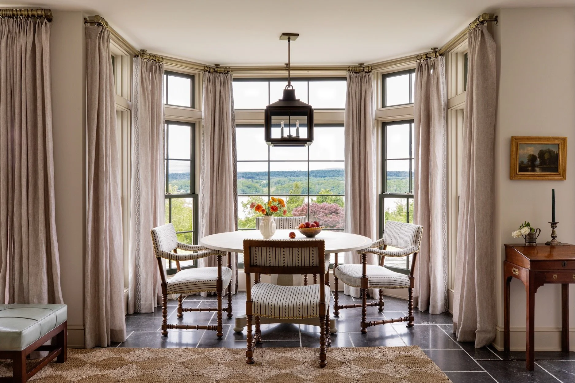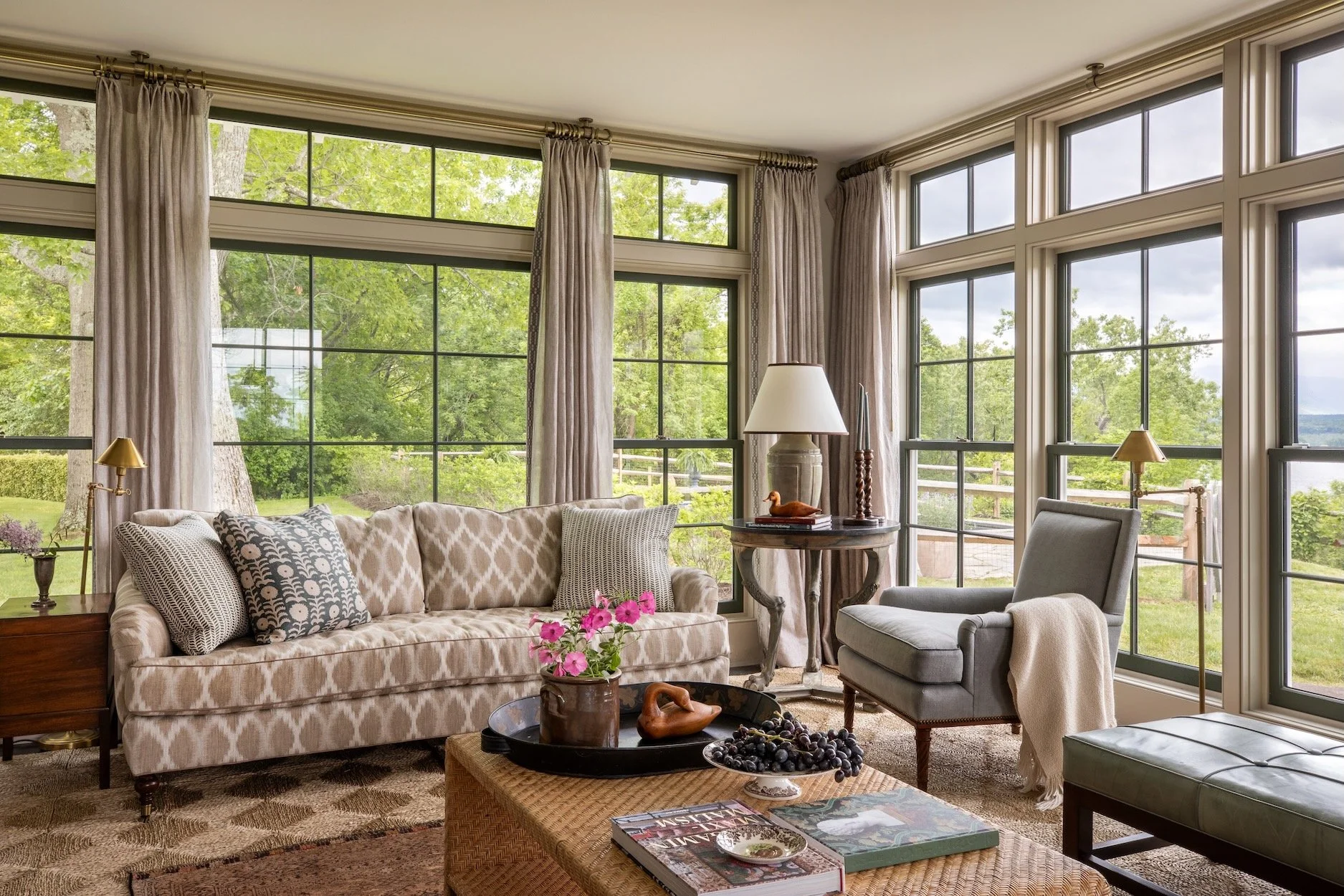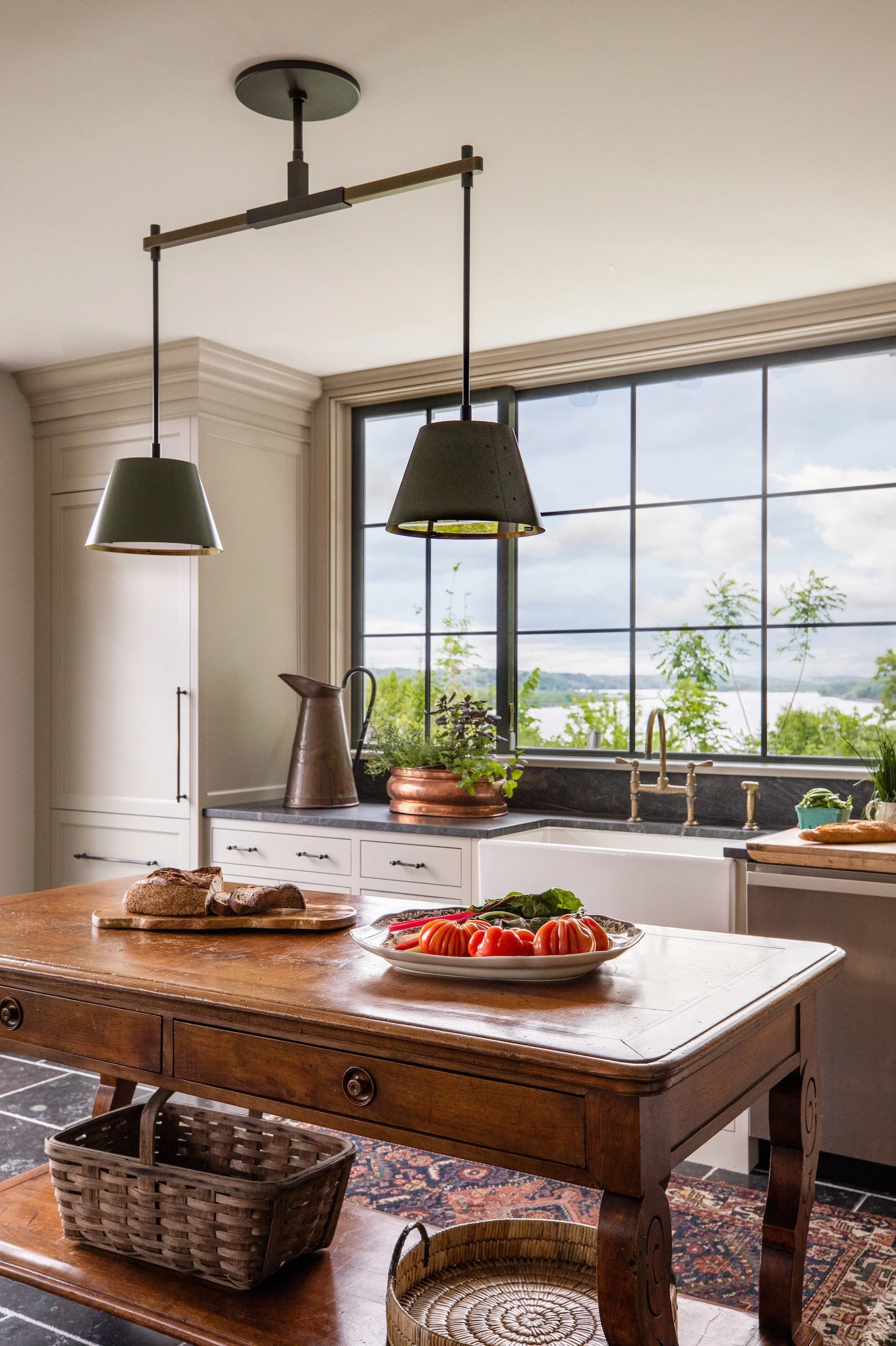 The interiors at Riversmeet complement the exceptional landscape surrounding it and were carefully envisioned by the brilliant designer Louise Copeland. The main living space is lined with floor-to-ceiling windows with Hudson River views, filling the home with golden light every day as the evening sets in. A large mudroom with built in shelves, a powder room lined with Peter Fasano grasscloth wallpaper, and a finished garage/gym/studio complete the first floor. Each space is adorned with charming details, from the Waterworks bath fixtures, to the custom millwork and cabinetry, and the impeccably curated lighting, all grounded by various slate, stone, and wood floors.