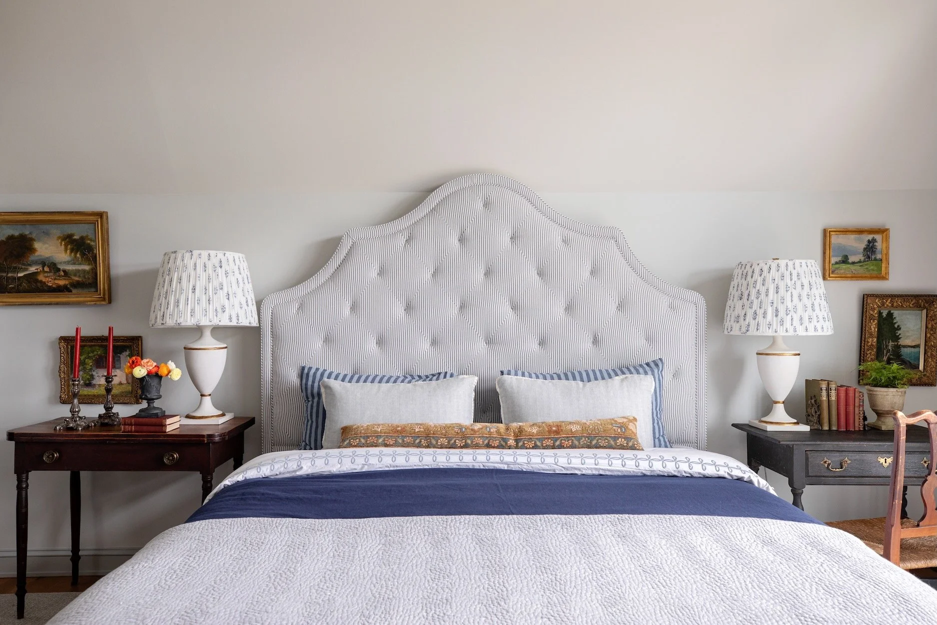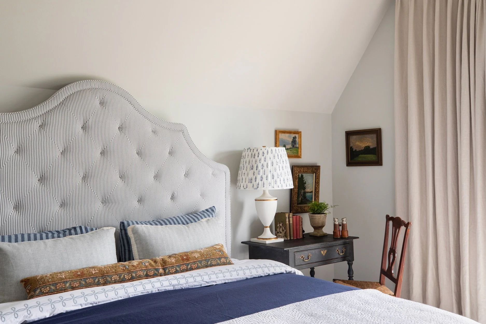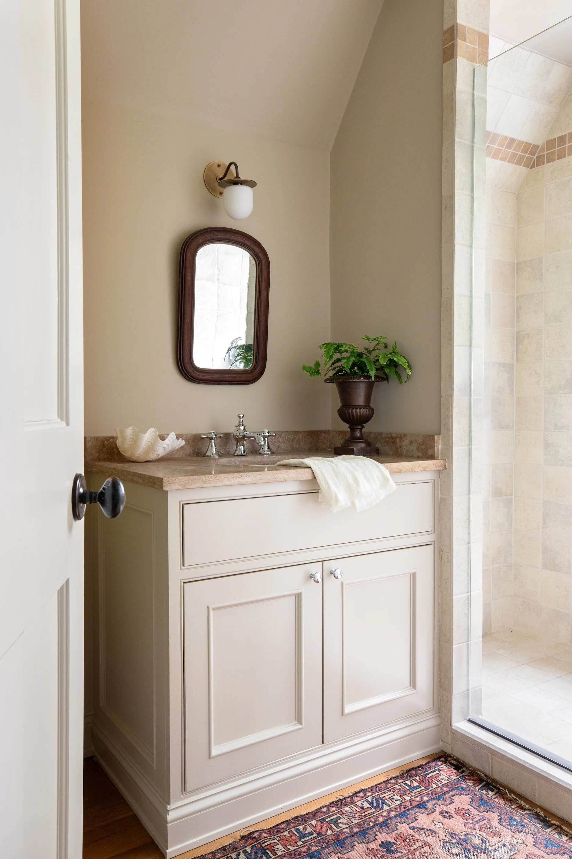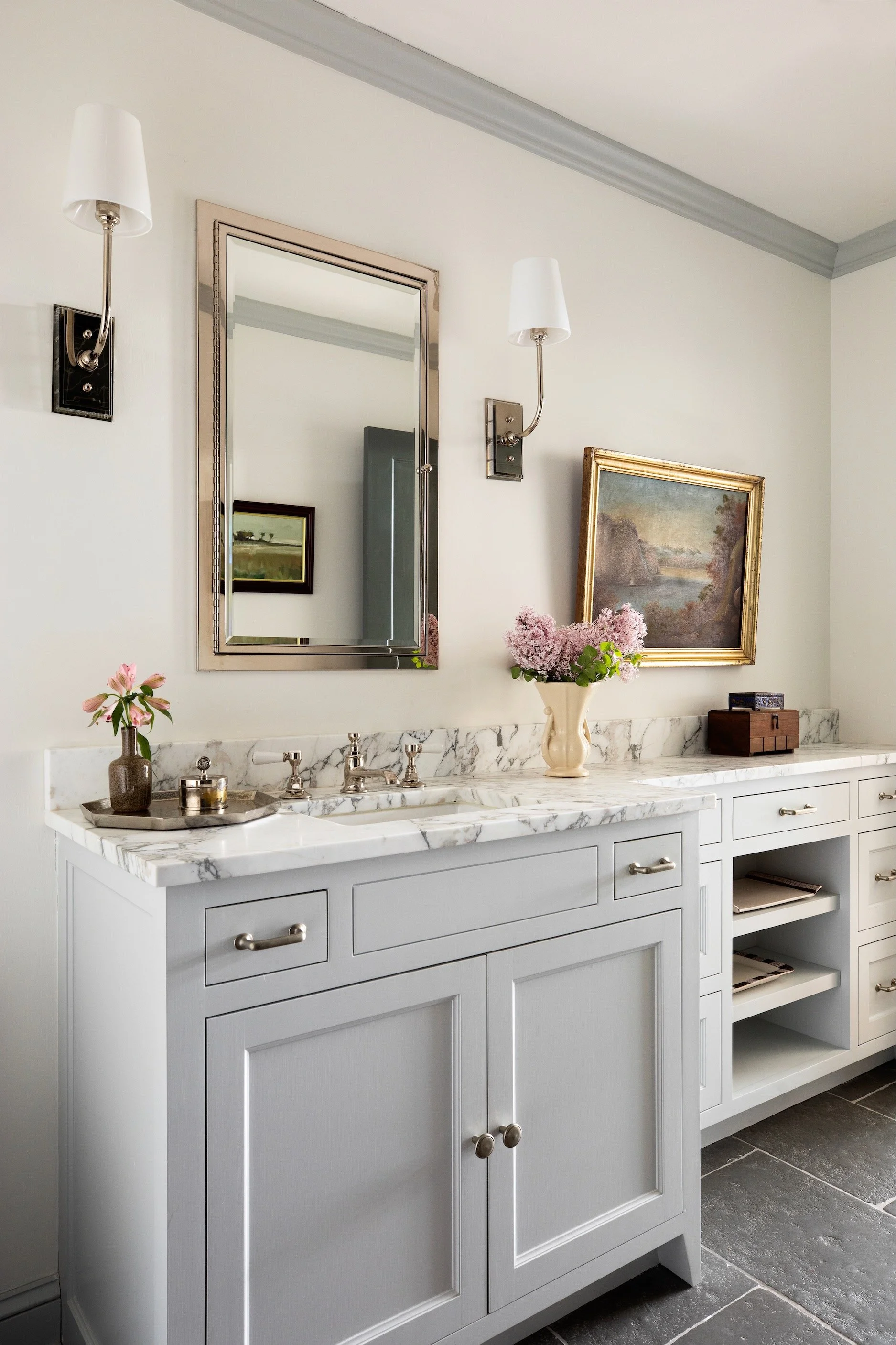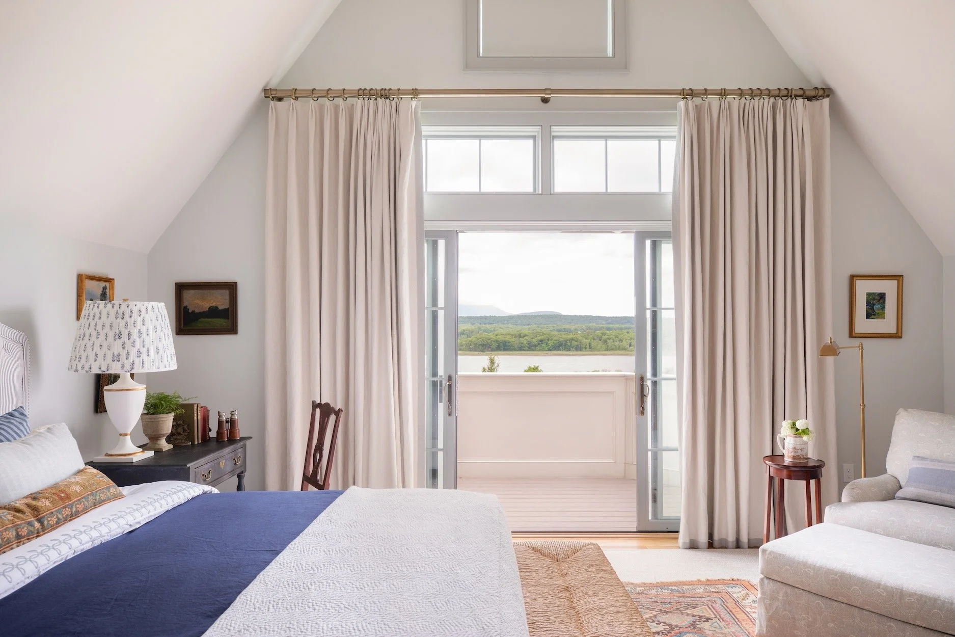 The interiors at Riversmeet complement the exceptional landscape surrounding it and were carefully envisioned by the brilliant designer Louise Copeland. The main living space is lined with floor-to-ceiling windows with Hudson River views, filling the home with golden light every day as the evening sets in. A large mudroom with built in shelves, a powder room lined with Peter Fasano grasscloth wallpaper, and a finished garage/gym/studio complete the first floor. Each space is adorned with charming details, from the Waterworks bath fixtures, to the custom millwork and cabinetry, and the impeccably curated lighting, all grounded by various slate, stone, and wood floors.