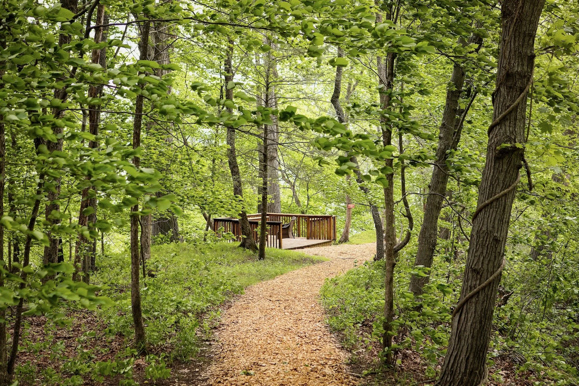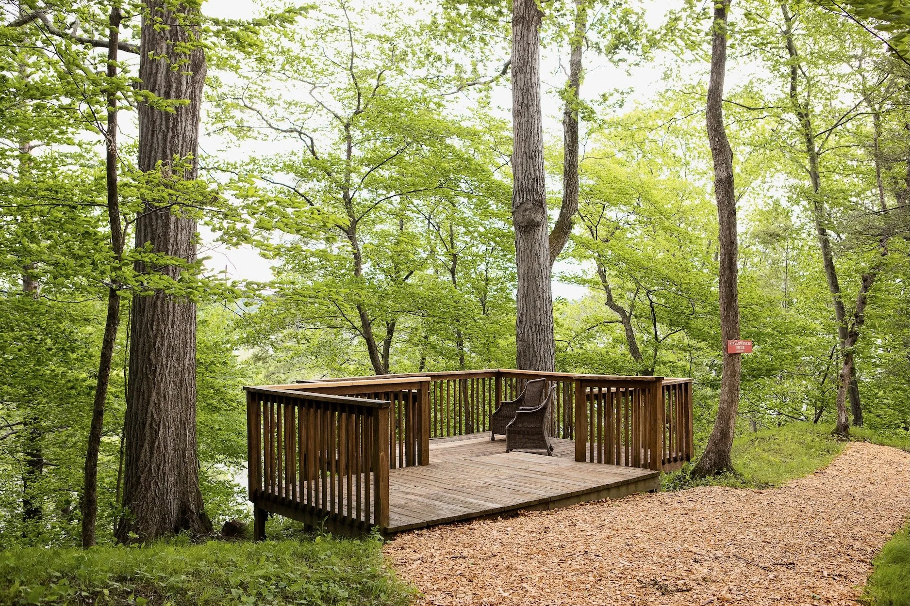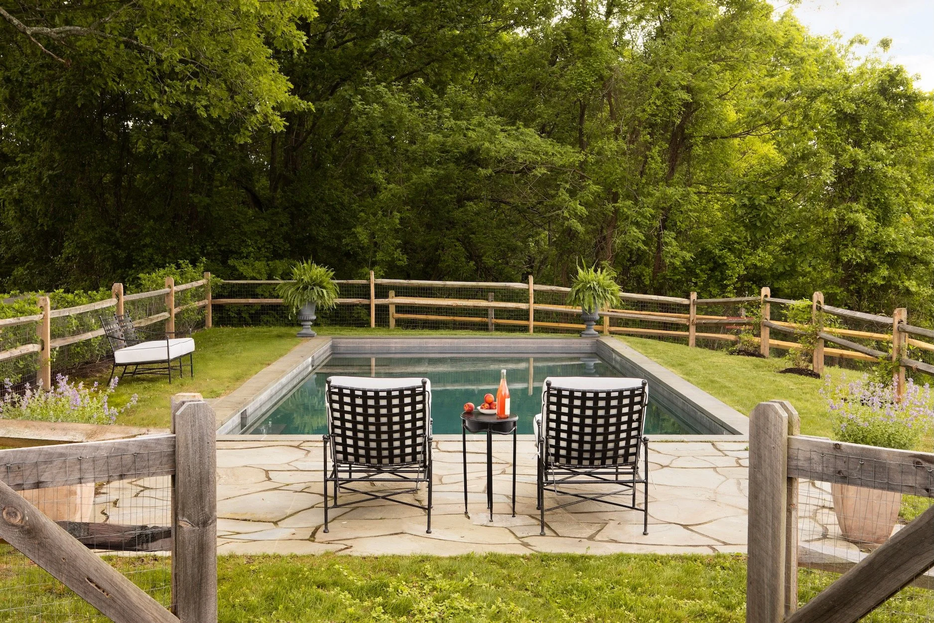 The 12-acre grounds at Riversmeet are exceptionally well cultivated. An exquisite gunite pool with a stone patio for loungers is lined with mature hydrangea bushes and looks out onto the river. The bluestone dining terrace wraps around the front of the house and rests above the grassy knoll that unfurls gently below. Through the woods is a series of trails leading to a lookout deck, a striking ridge, and the banks of the Roeliff Jansen Kill, offering easy access to the Hudson for kayaking and boating.