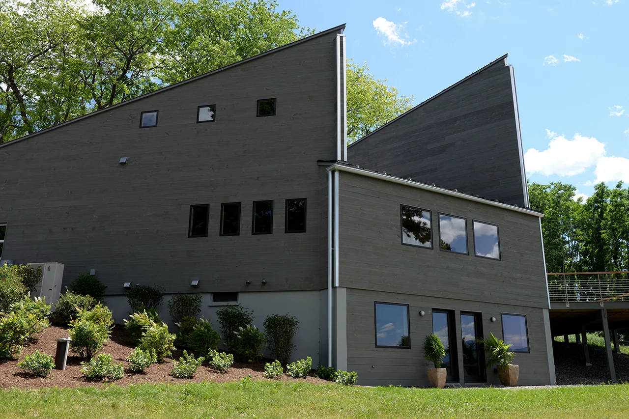 Modernist architectural masterpiece on the Hudson with spectacular views of the river, atmospheric views of ships sailing by and cool sunsets over the Catskill mountains. 8 riverfront acres landscaped with flowering bushes, trees, stonework and a gorgeous pool. Metal roof, natural wide board wood siding in a warm grey color blending into the non-colors of it's surroundings reminiscent of the west coast Sea Ranch community, and a handsome deck. The architect's vision meticulously fleshed out by master local craftsmen with attention to every detail.
