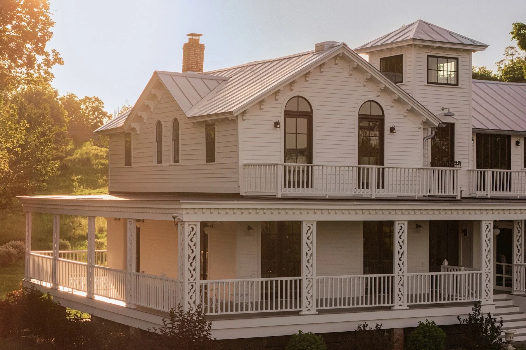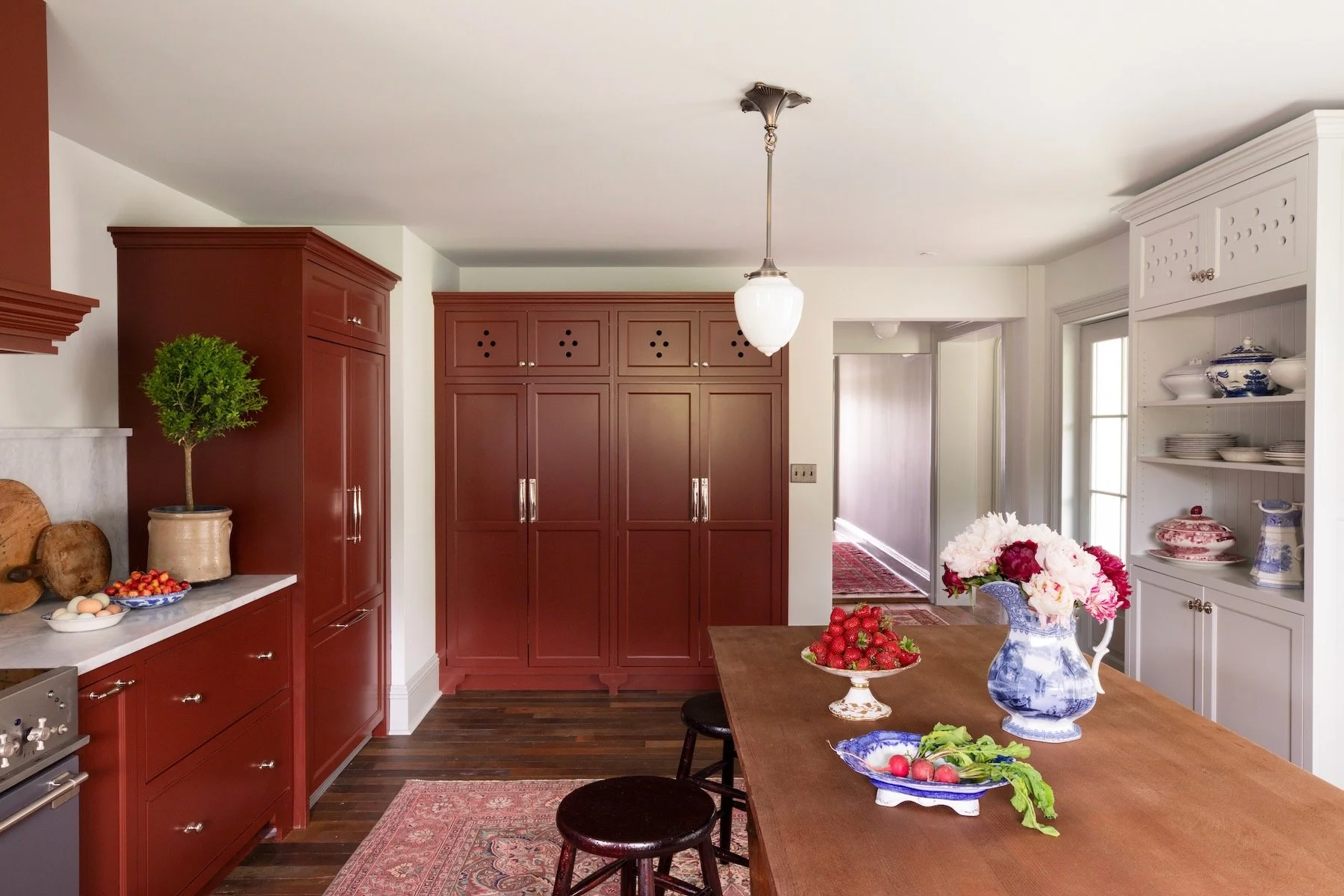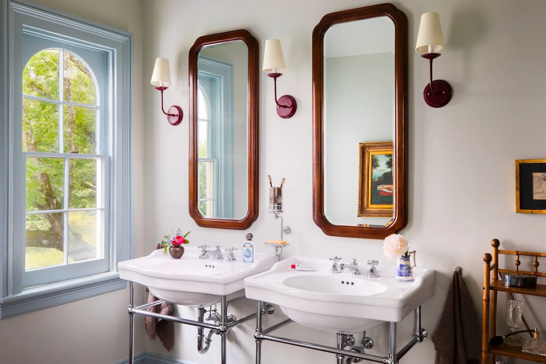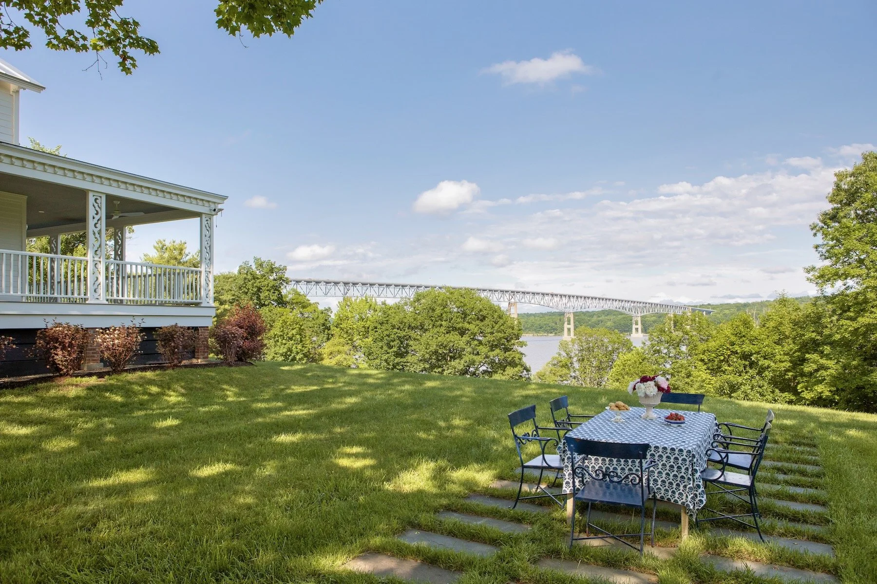 On the first floor, the formal living and dining rooms have exquisite views of the river and are connected by the original arched doors. French doors line the living spaces, opening to the home's wraparound porch and overlooking the surrounding gardens and bluestone dining terrace. Inside, the deep berry-red kitchen was a painstaking collaboration between a local craftsman and the home's designer, with elaborate millwork, an AGA range, multiple restored historic pieces, and ample pantry and appliance storage.