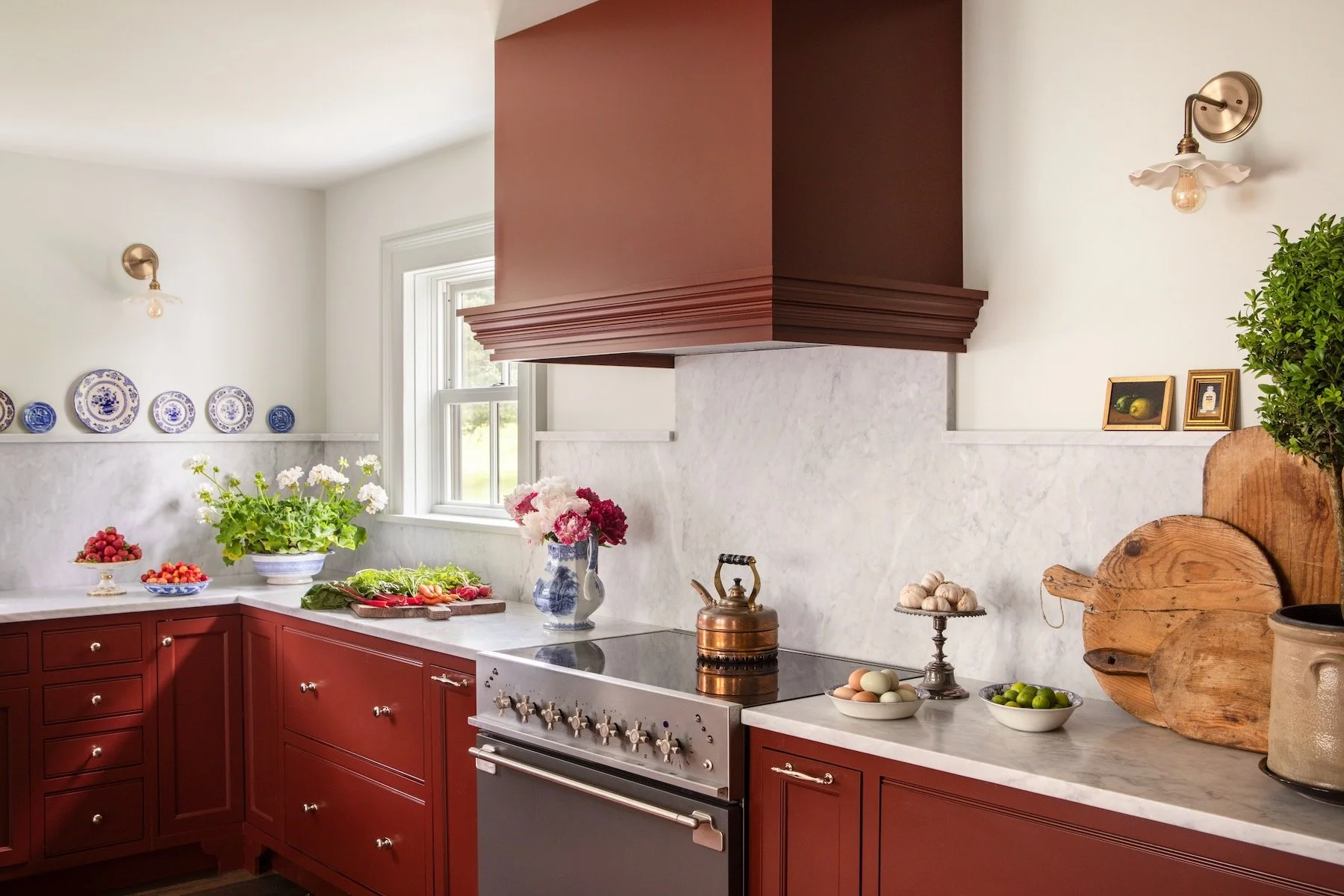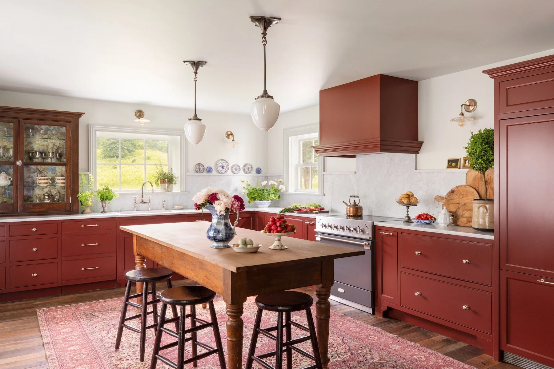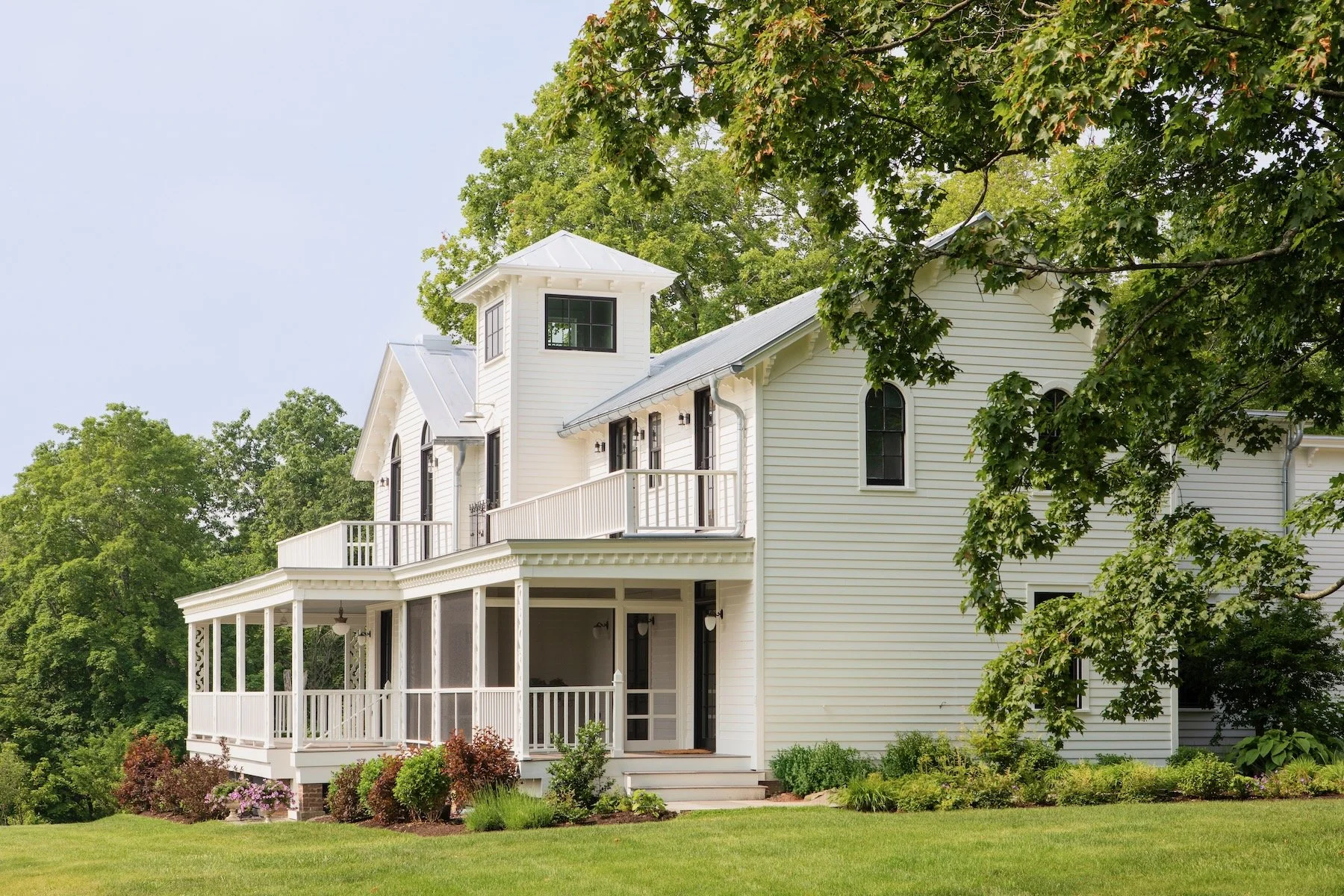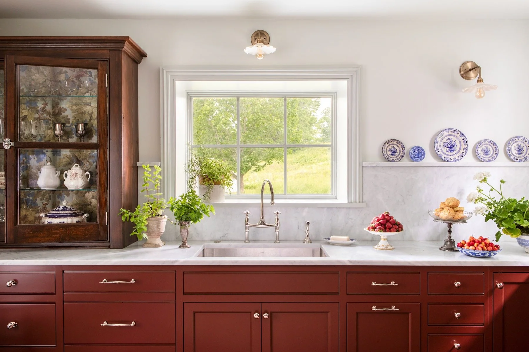 On the first floor, the formal living and dining rooms have exquisite views of the river and are connected by the original arched doors. French doors line the living spaces, opening to the home's wraparound porch and overlooking the surrounding gardens and bluestone dining terrace. Inside, the deep berry-red kitchen was a painstaking collaboration between a local craftsman and the home's designer, with elaborate millwork, an AGA range, multiple restored historic pieces, and ample pantry and appliance storage.
