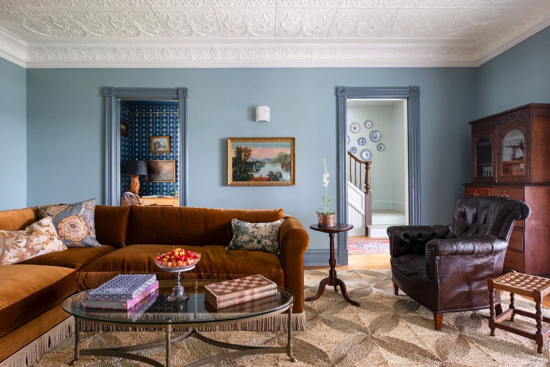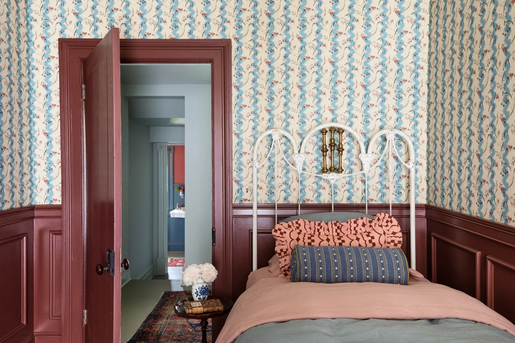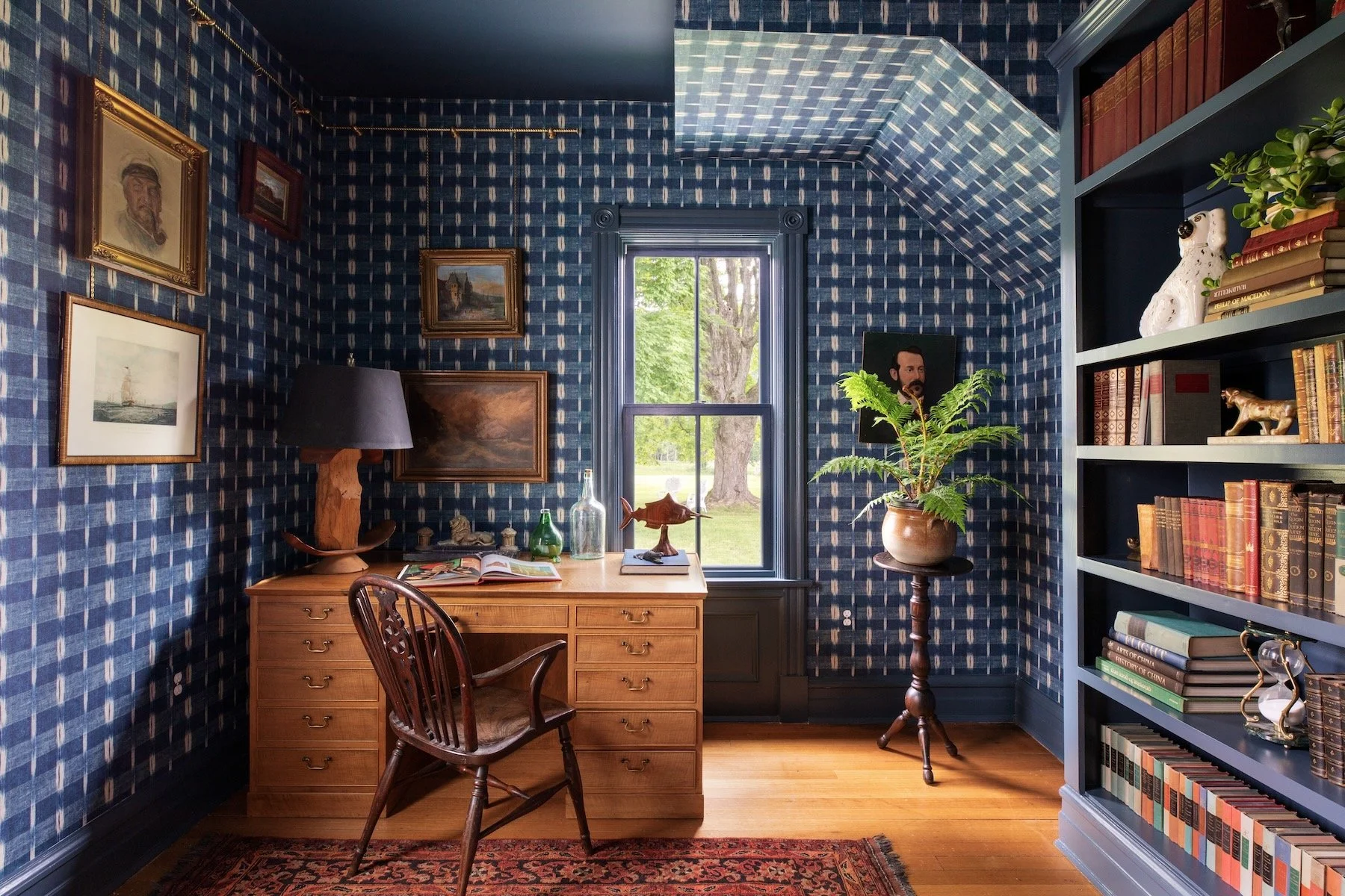 The family room, originally the home's entertaining space, was envisioned in a moodier, more playful palette of colors and textures, highlighting the historic tin ceilings and the original cabinetry that contains the home's mid-19th-century dumbwaiter system. Off of the family room lies the office and library, with built-in bookshelves and a characterful indigo Antoinette Poisson wallpaper. A full bath/powder room sits tucked away near the owner's entry and is lined with tasteful floral wallpaper and deep red woodwork.