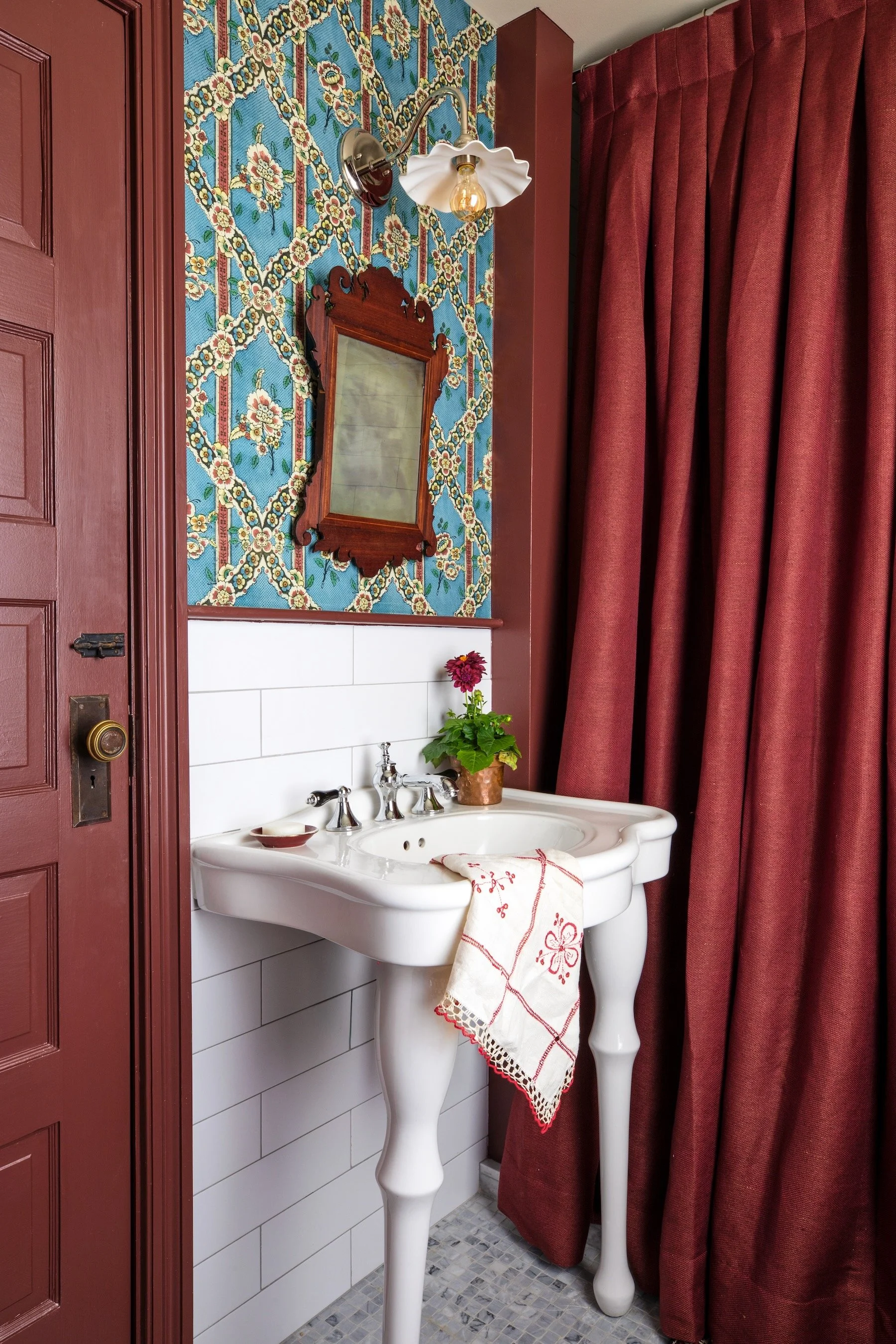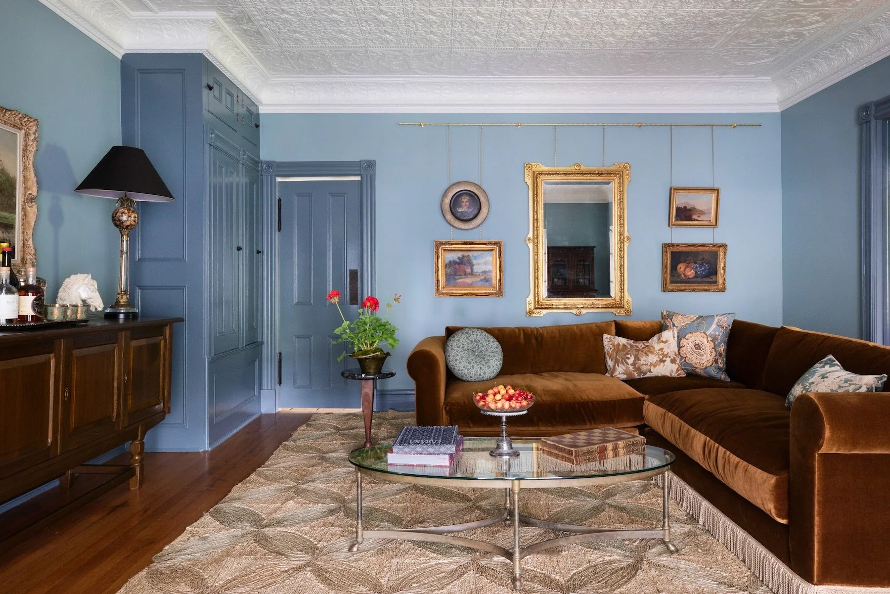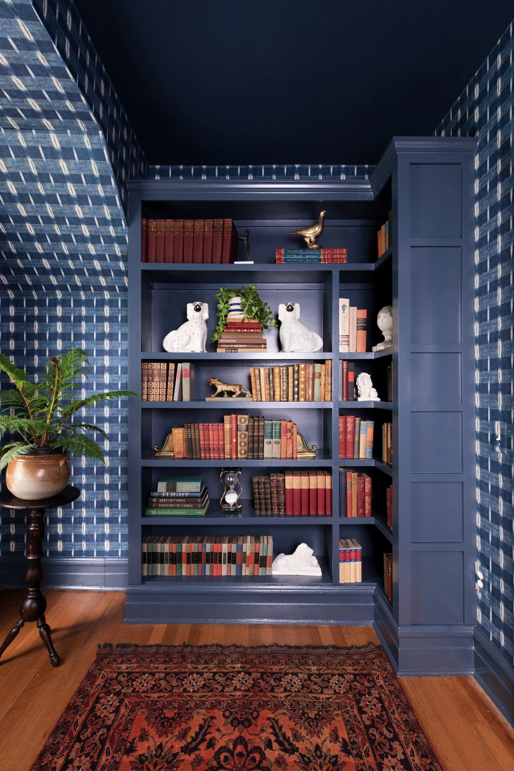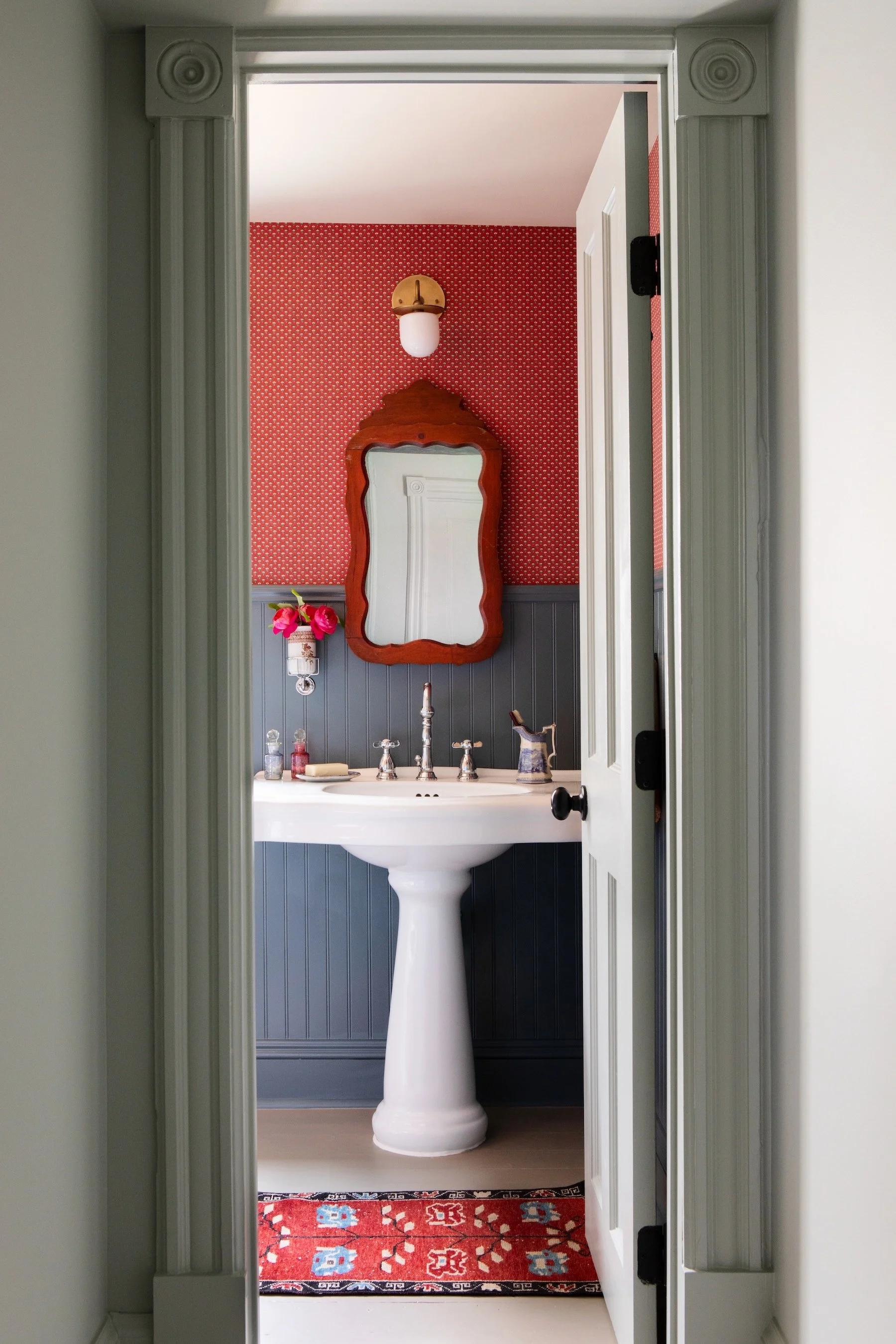 The family room, originally the home's entertaining space, was envisioned in a moodier, more playful palette of colors and textures, highlighting the historic tin ceilings and the original cabinetry that contains the home's mid-19th-century dumbwaiter system. Off of the family room lies the office and library, with built-in bookshelves and a characterful indigo Antoinette Poisson wallpaper. A full bath/powder room sits tucked away near the owner's entry and is lined with tasteful floral wallpaper and deep red woodwork.