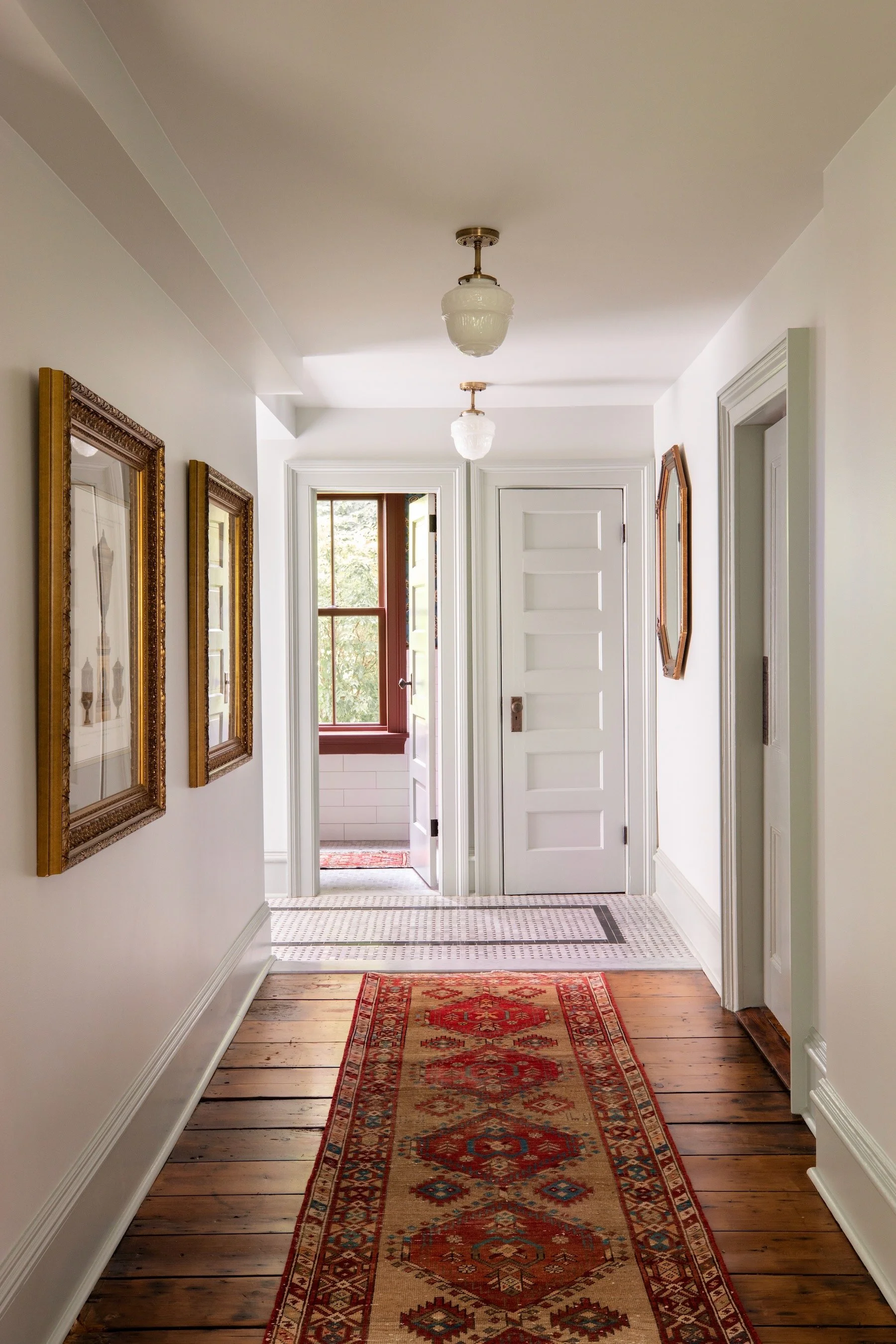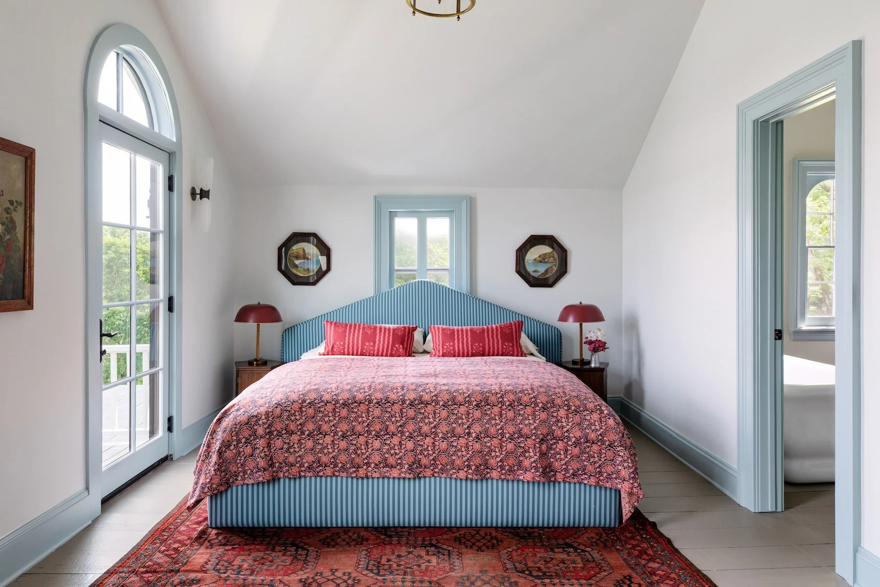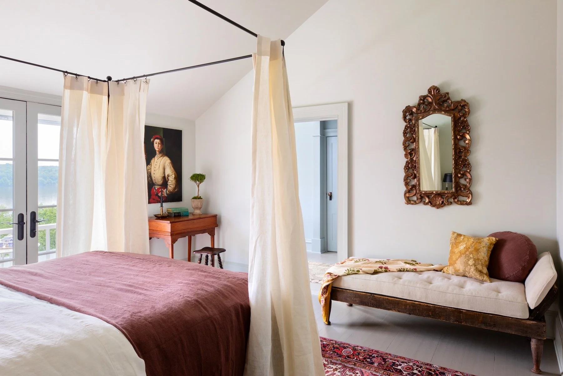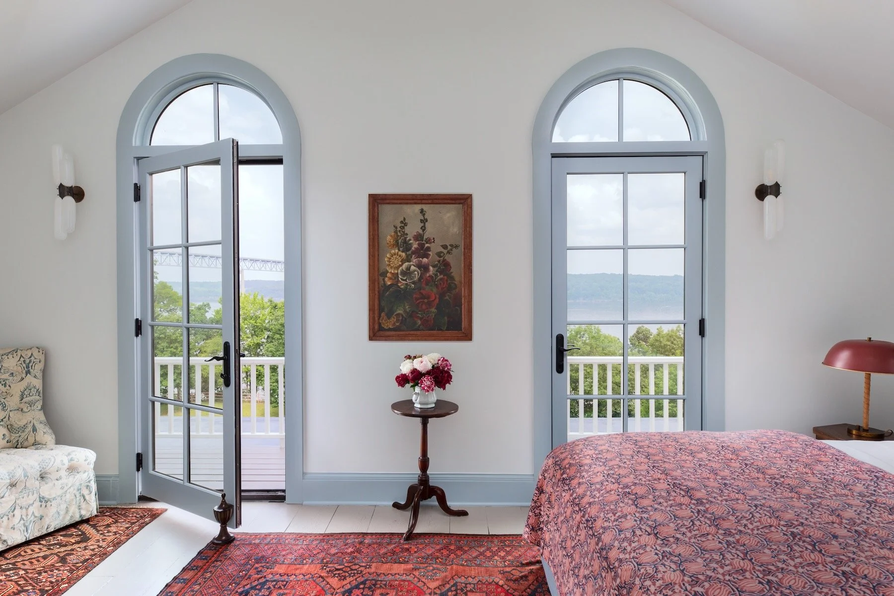 The owner's wing is home to the primary suite and a kid's suite. The primary bedroom features tall, vaulted ceilings and large, arched French doors that lead out to a balcony offering exceptional river views. A discreet hallway off the bedroom leads to an expansive dressing room with built-in closets and a fireplace. The location and size of the dressing room lends itself well to hybrid functions, such as a nursery or an upstairs office/reading area. The primary bath has twin original arched windows, a freestanding soaking tub facing the Hudson, and an alcoved toilet and shower. Down the hall from the primary bedroom is the colorful kid's room with striped Swedish wallpaper and a walk-in closet. The two-toned kid's bath has a claw-foot tub with a shower surround. Second-floor laundry and a large linen closet complete the owner's wing.