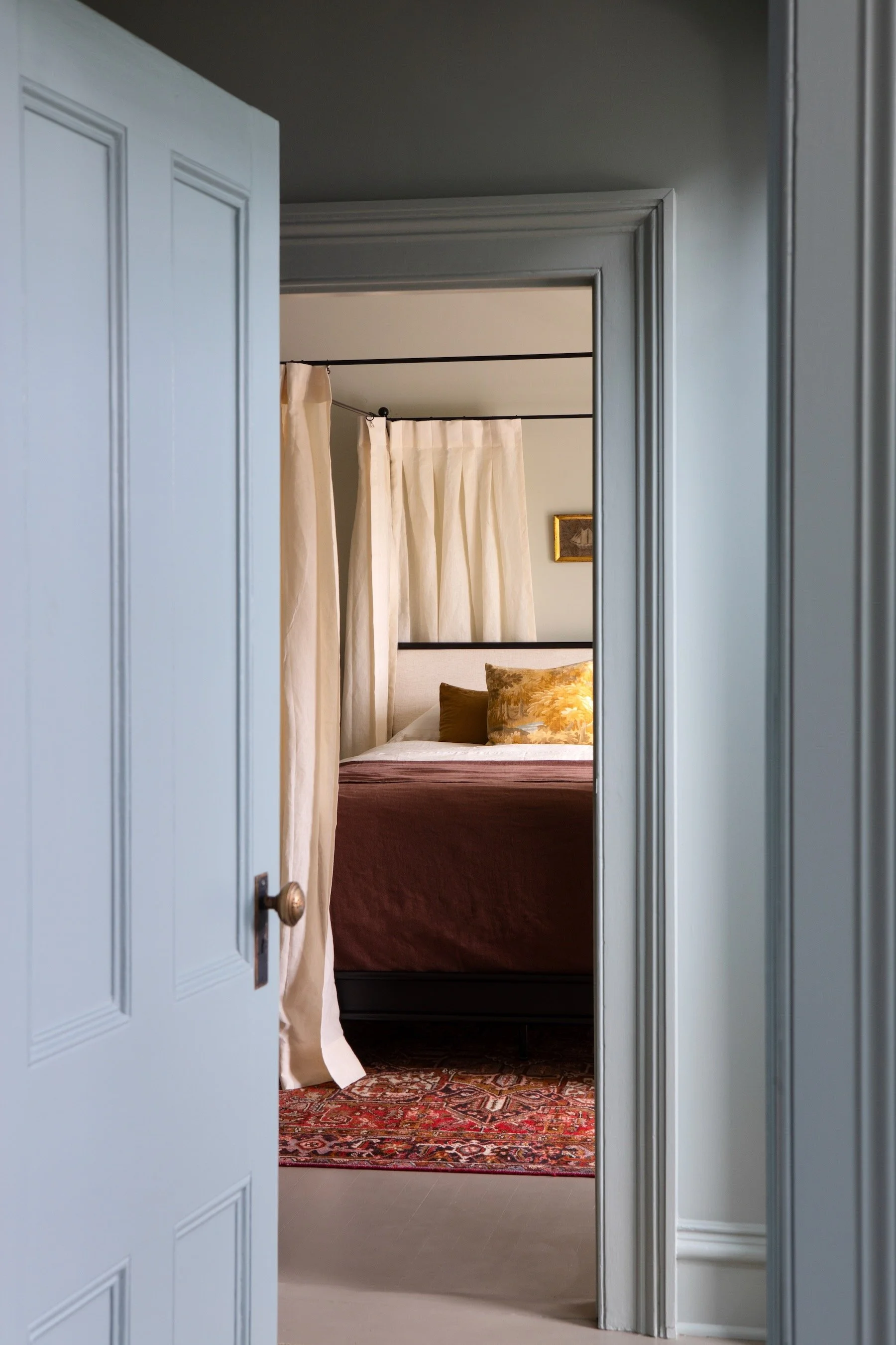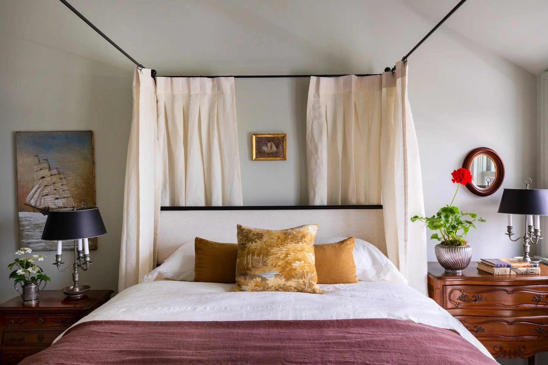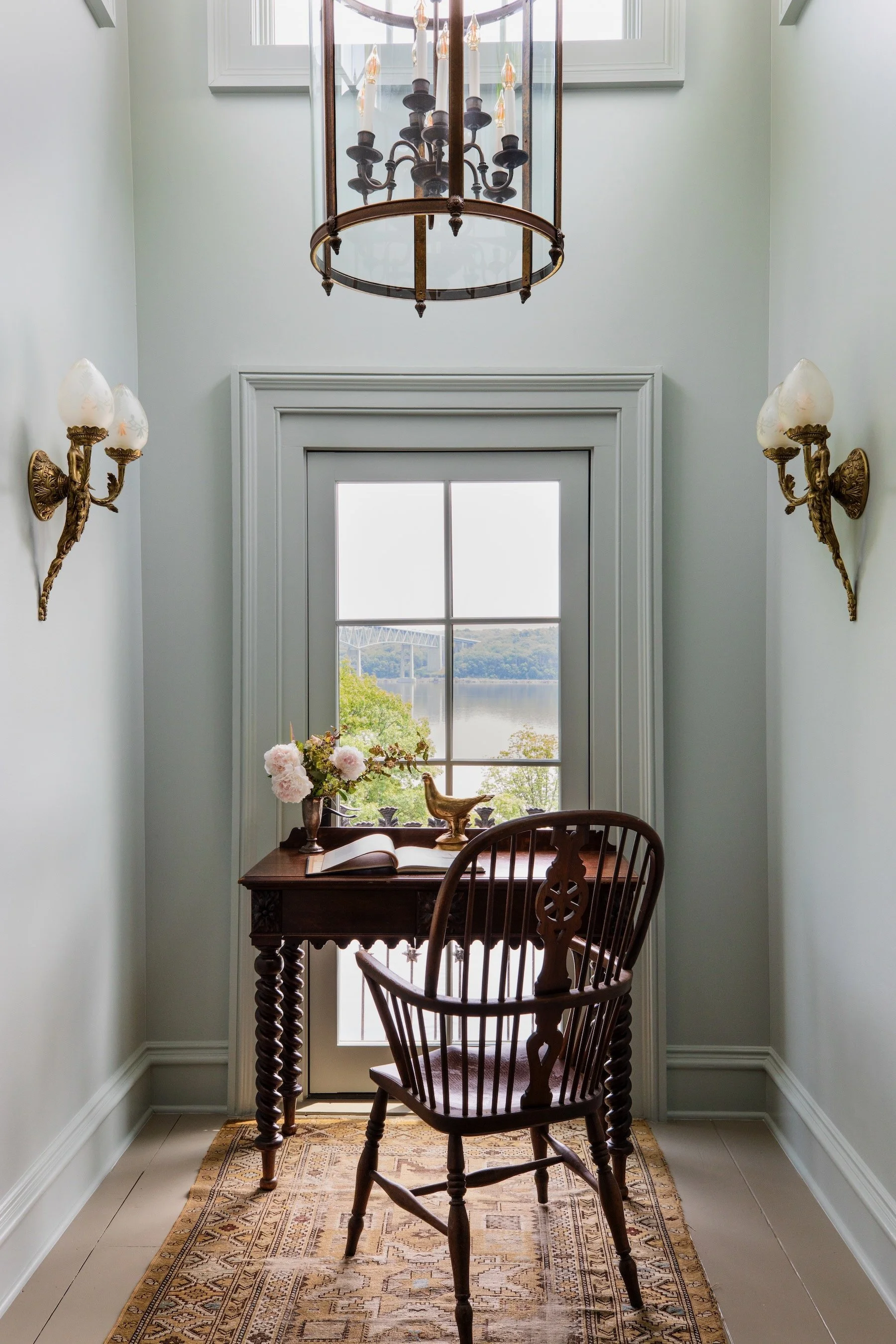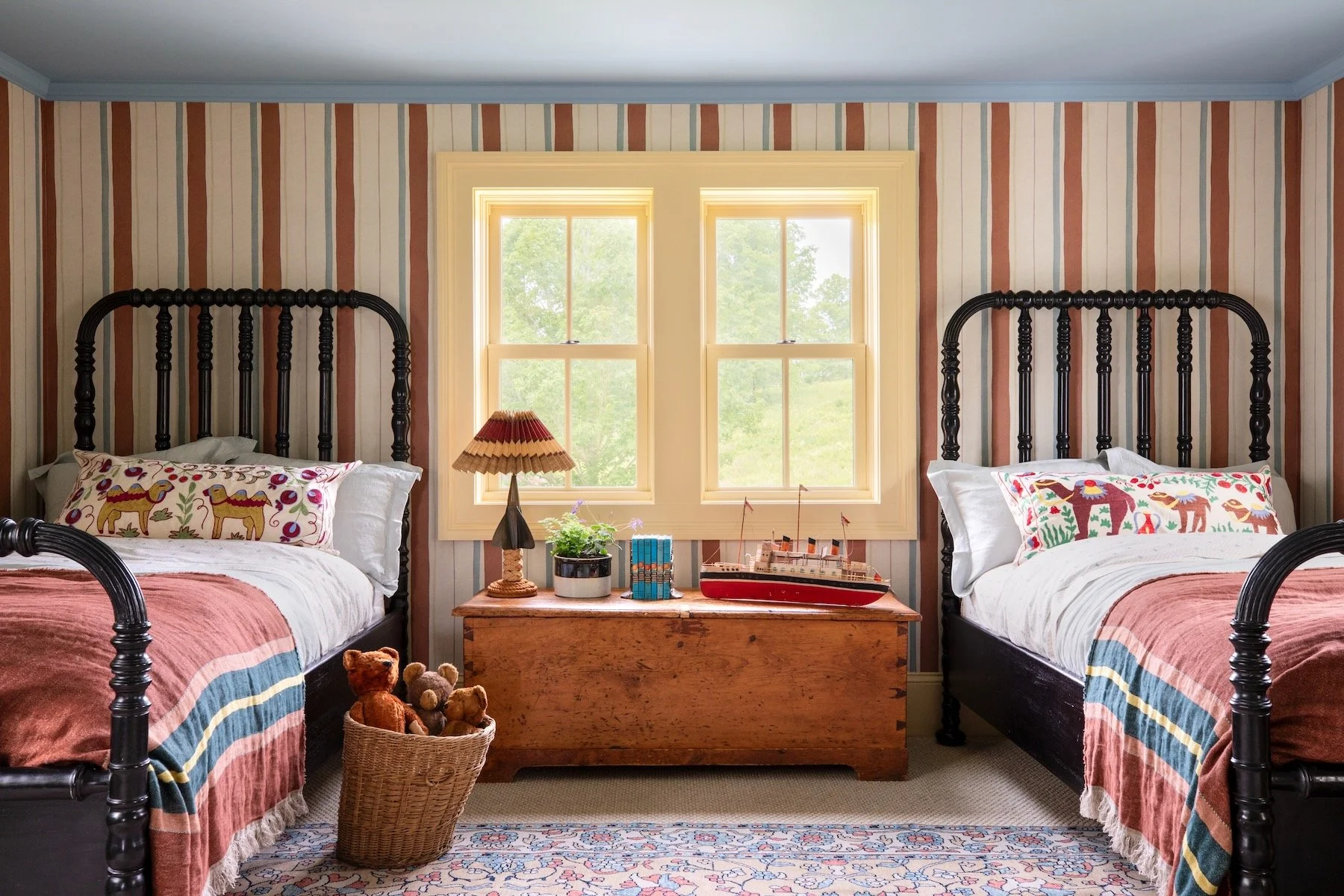 The owner's wing is home to the primary suite and a kid's suite. The primary bedroom features tall, vaulted ceilings and large, arched French doors that lead out to a balcony offering exceptional river views. A discreet hallway off the bedroom leads to an expansive dressing room with built-in closets and a fireplace. The location and size of the dressing room lends itself well to hybrid functions, such as a nursery or an upstairs office/reading area. The primary bath has twin original arched windows, a freestanding soaking tub facing the Hudson, and an alcoved toilet and shower. Down the hall from the primary bedroom is the colorful kid's room with striped Swedish wallpaper and a walk-in closet. The two-toned kid's bath has a claw-foot tub with a shower surround. Second-floor laundry and a large linen closet complete the owner's wing.