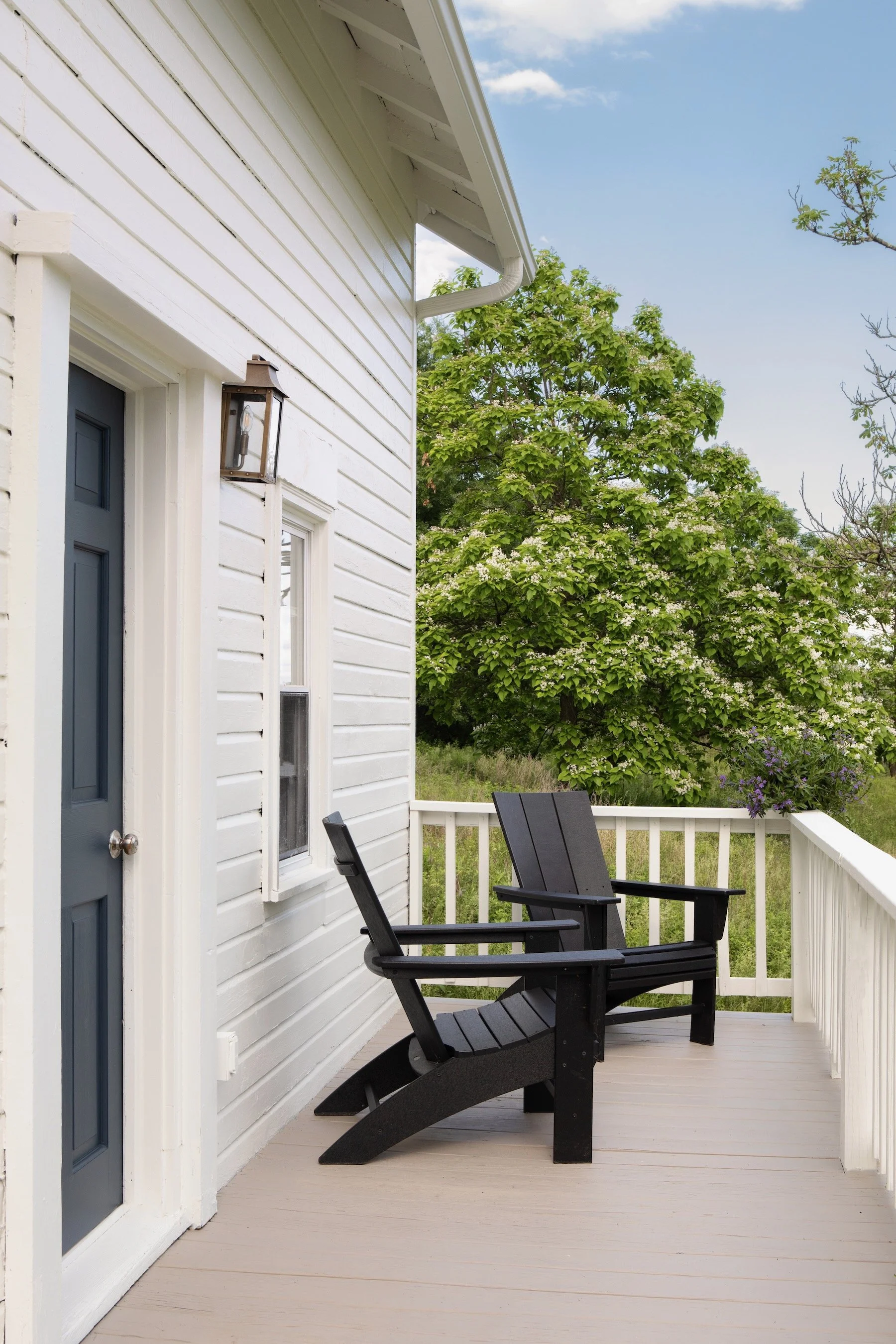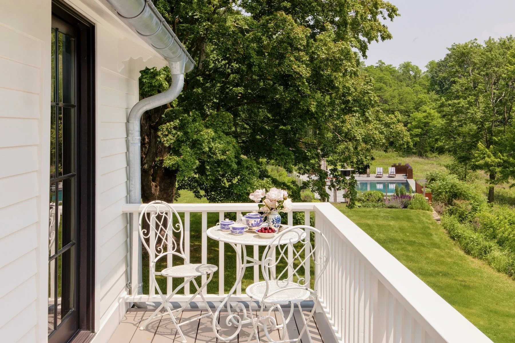 A long balcony runs along the entire guest wing, offering access via French doors in the double guest suite and the single guest room. The double room features vaulted ceilings, an extra-large walk-in closet, and a full bath. The single room has detailed millwork and playful wallpaper, with its accompanying bathroom down the hall.