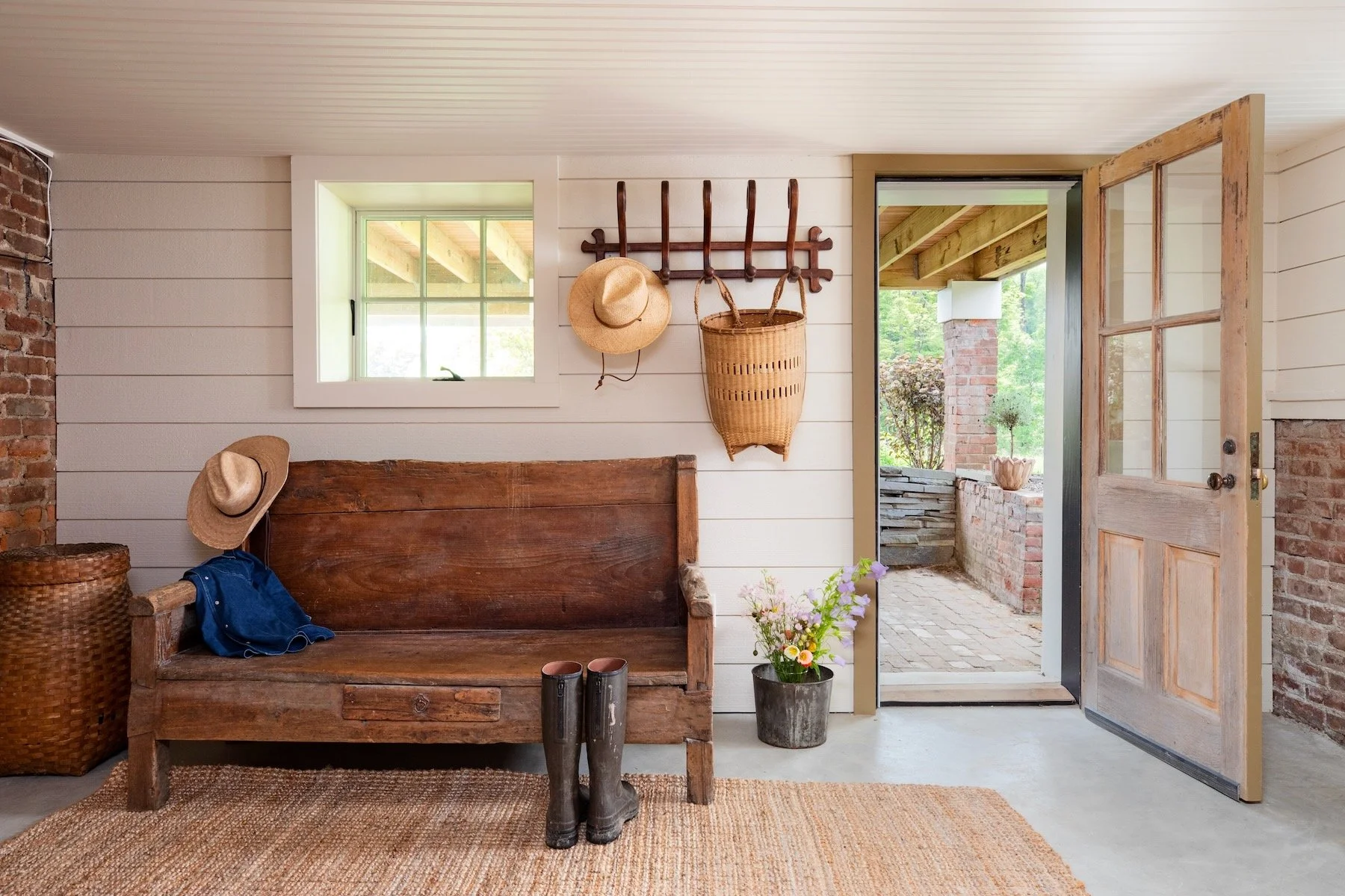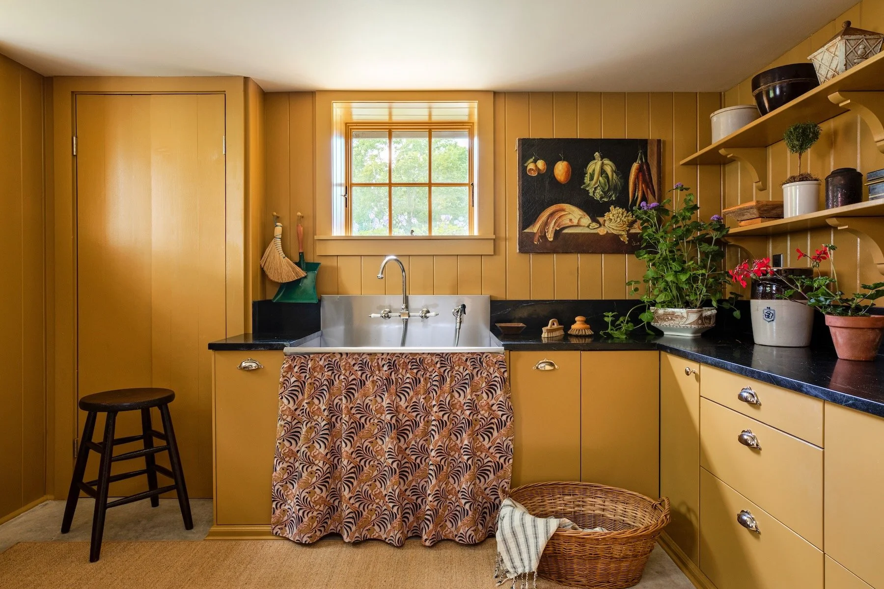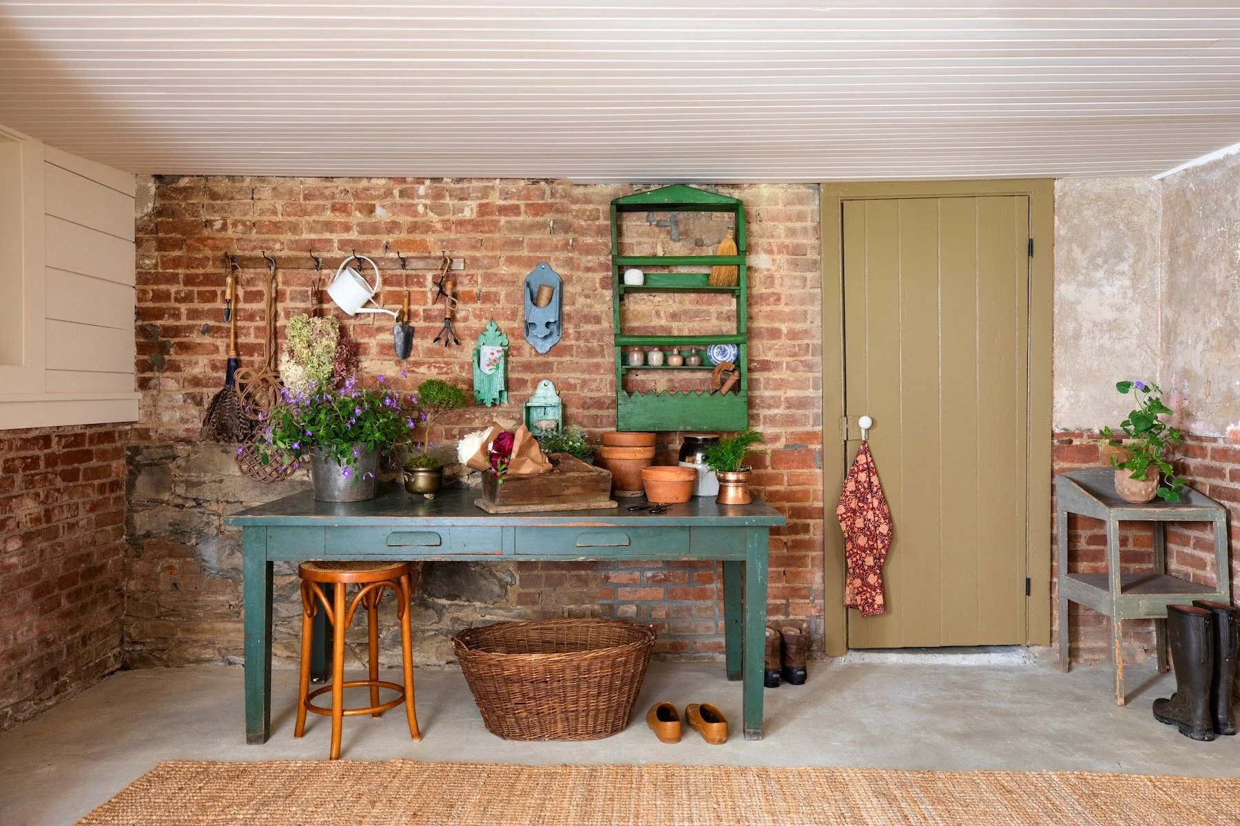 The home is not short on functional yet tasteful utility spaces, with the ground-floor rooms converted into a laundry room, gardening mudroom, pantry and walk-in refrigerator, as well as significant storage space. The laundry and flower room is painted a deep ochre color, with ample built-in cabinetry, an XL utility sink, open shelving for vases, and two sets of high-capacity washers and dryers. The gardening mudroom has exposed historic brick walls and access to the surrounding herb and flower gardens, wood storage, and the exterior potting station.