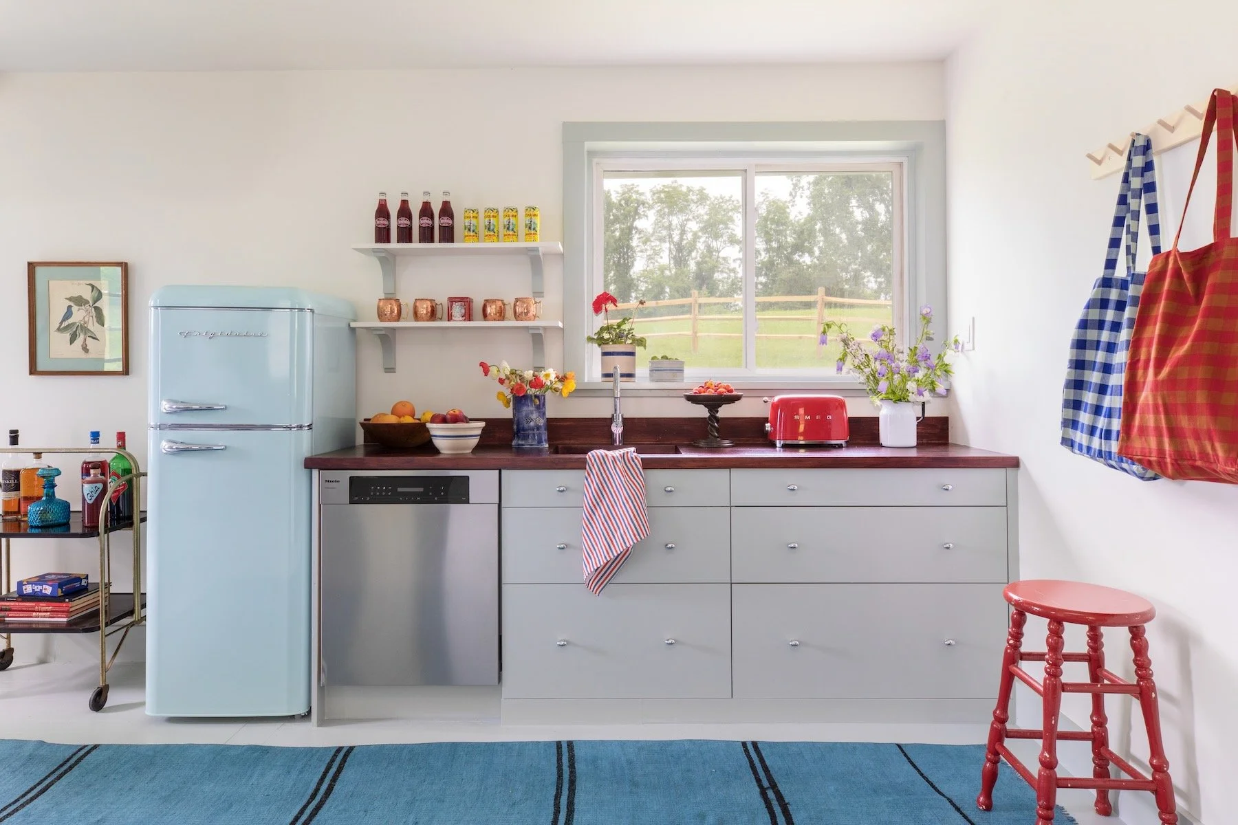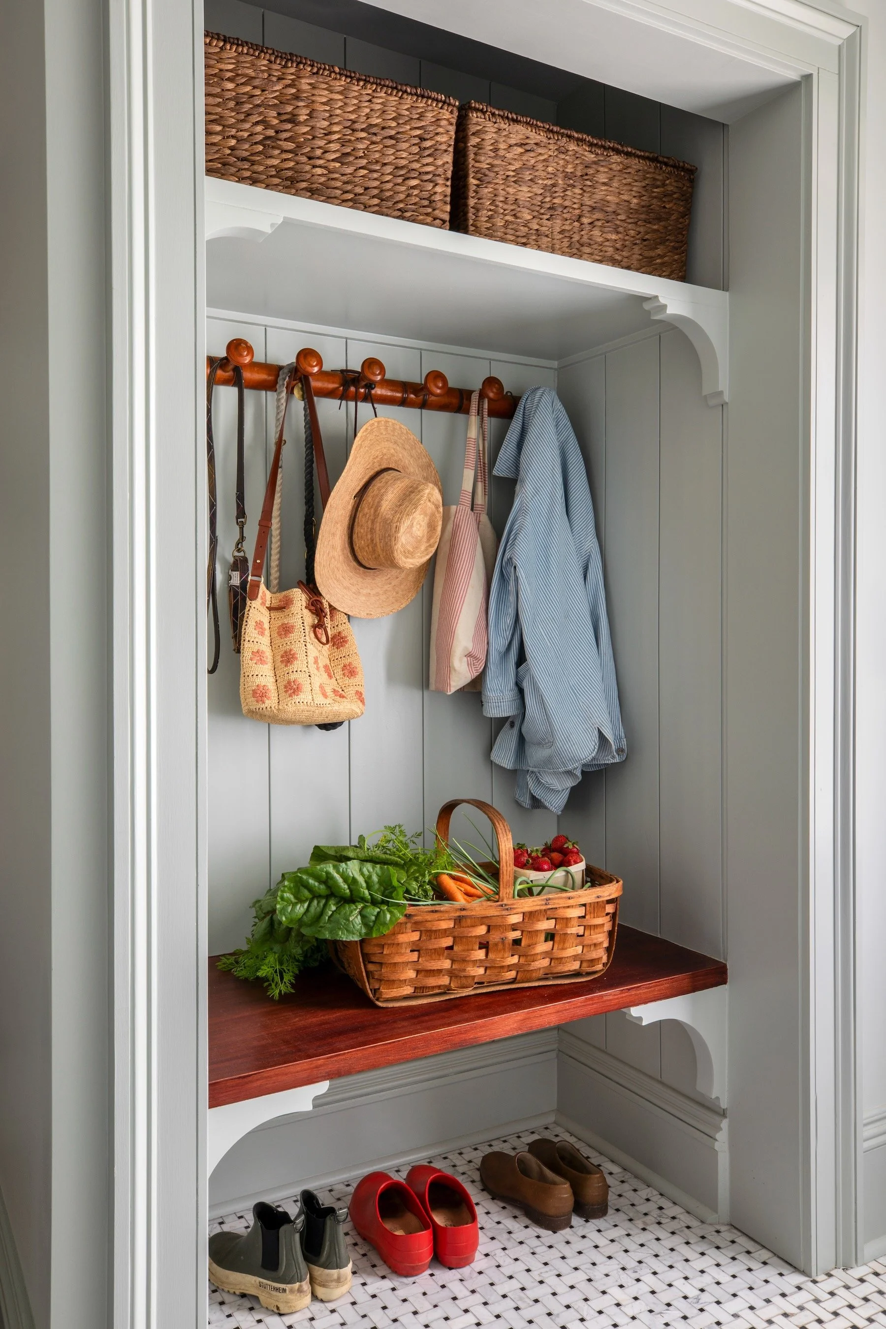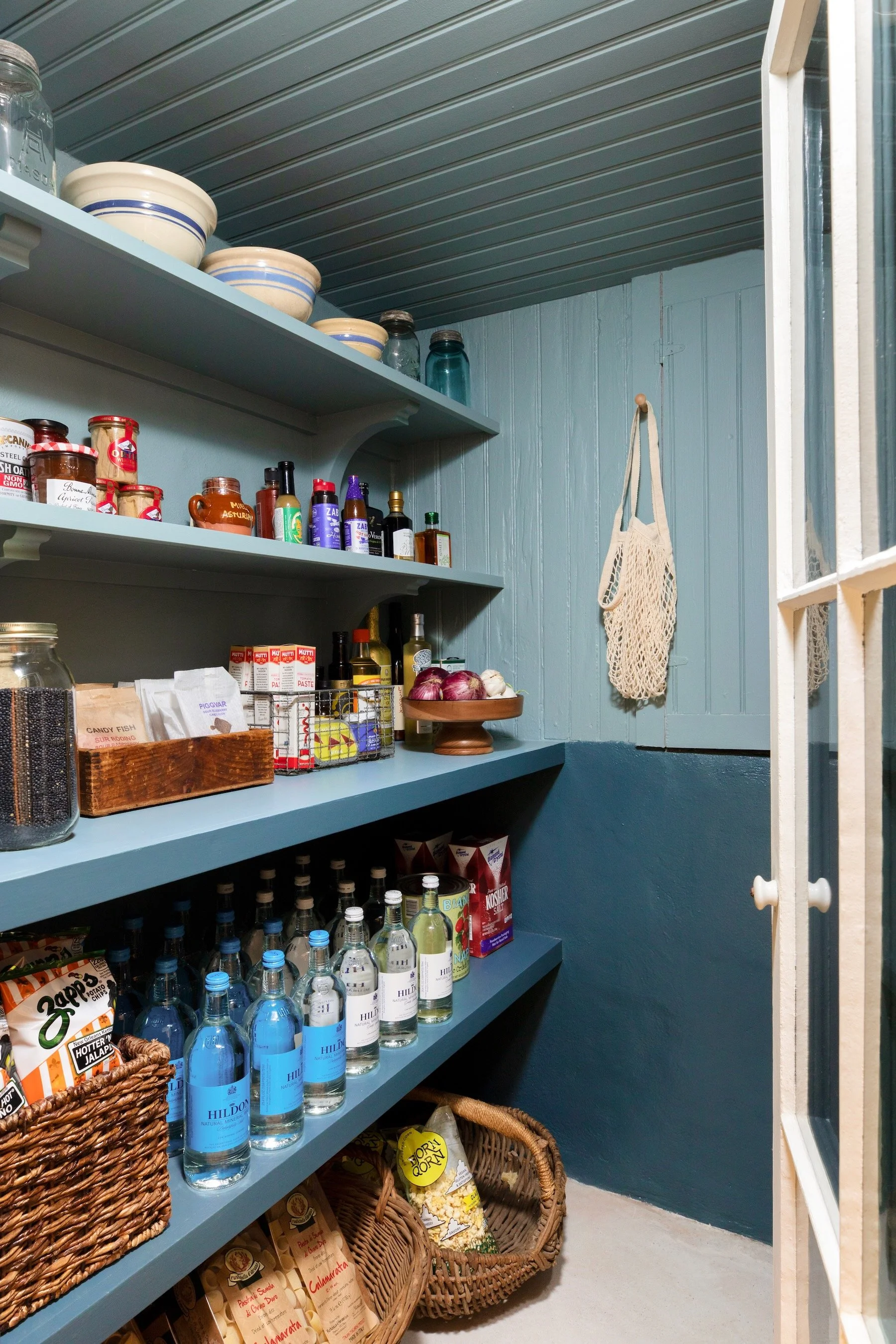 The home is not short on functional yet tasteful utility spaces, with the ground-floor rooms converted into a laundry room, gardening mudroom, pantry and walk-in refrigerator, as well as significant storage space. The laundry and flower room is painted a deep ochre color, with ample built-in cabinetry, an XL utility sink, open shelving for vases, and two sets of high-capacity washers and dryers. The gardening mudroom has exposed historic brick walls and access to the surrounding herb and flower gardens, wood storage, and the exterior potting station.