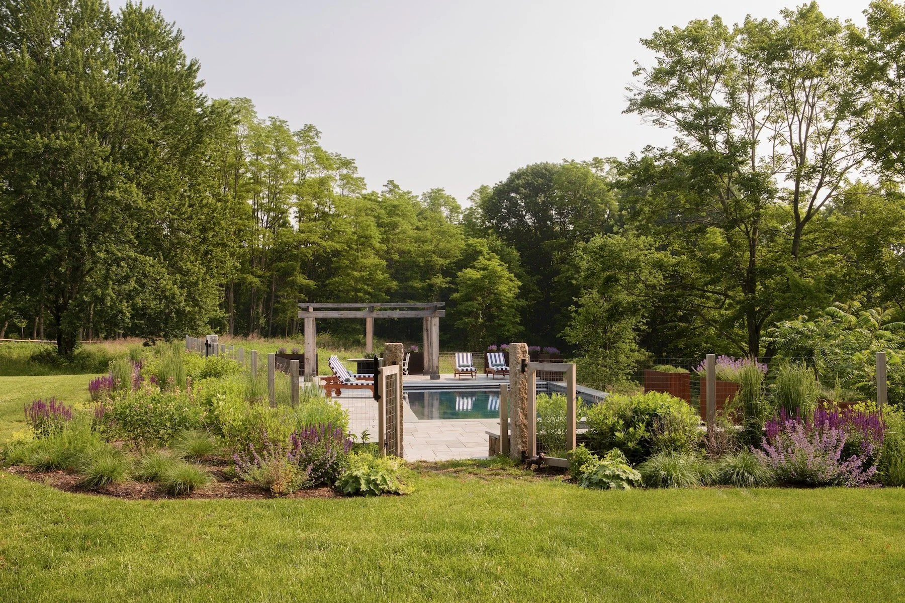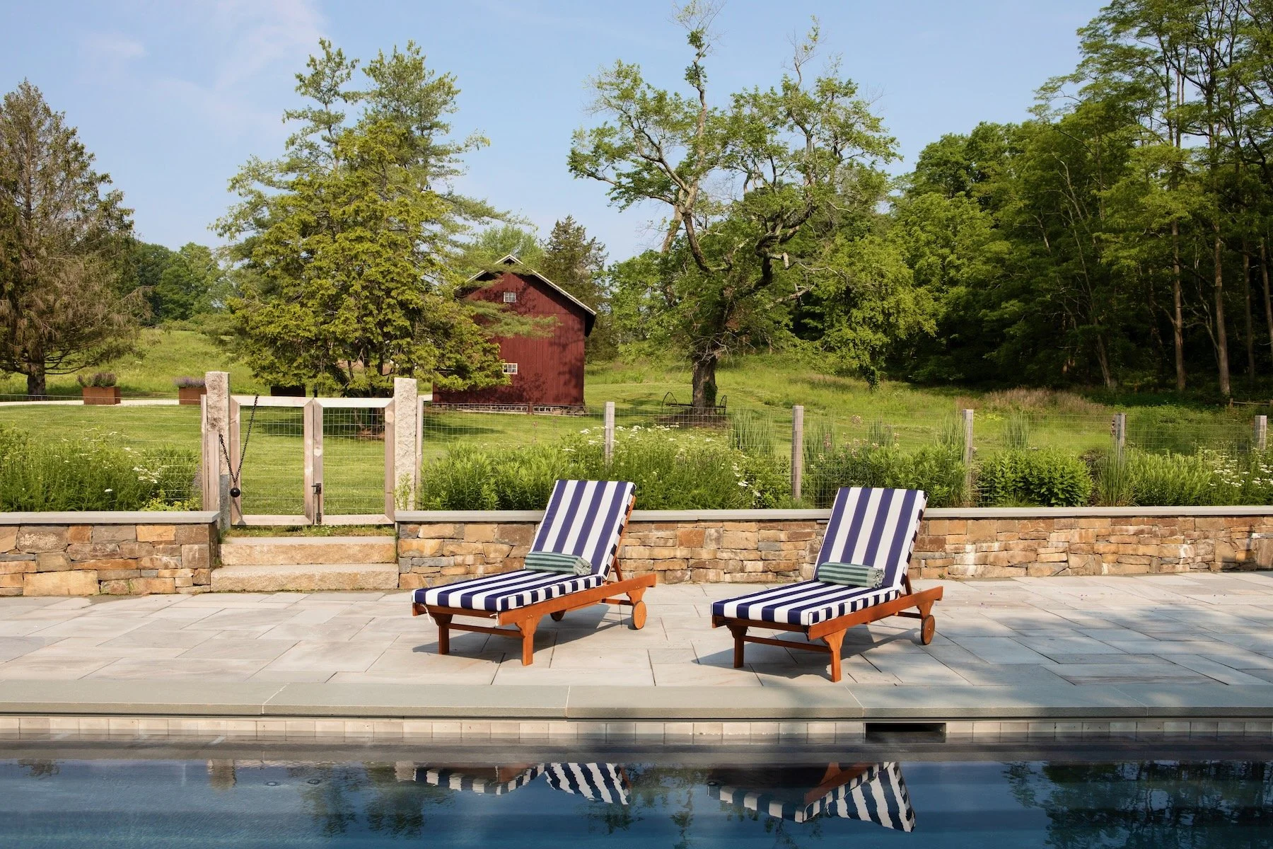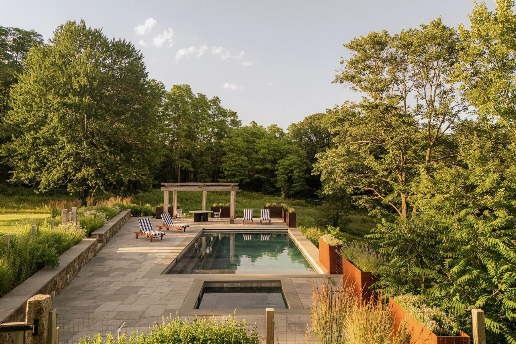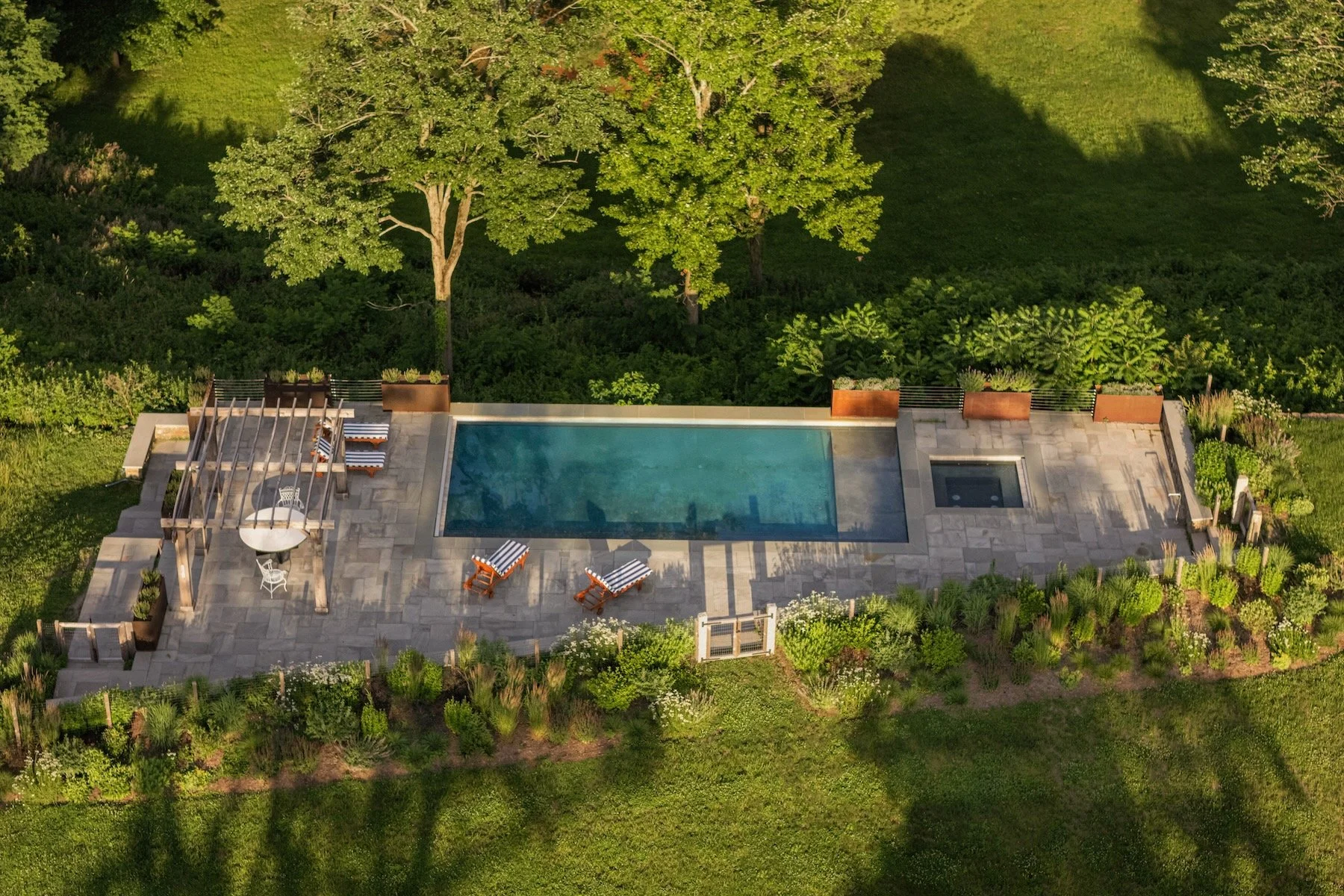 The heated gunite pool, spa, and surrounding bluestone terrace sit perched on top of a hill overlooking the river, with an outdoor shower and a concealed storage room built in below.