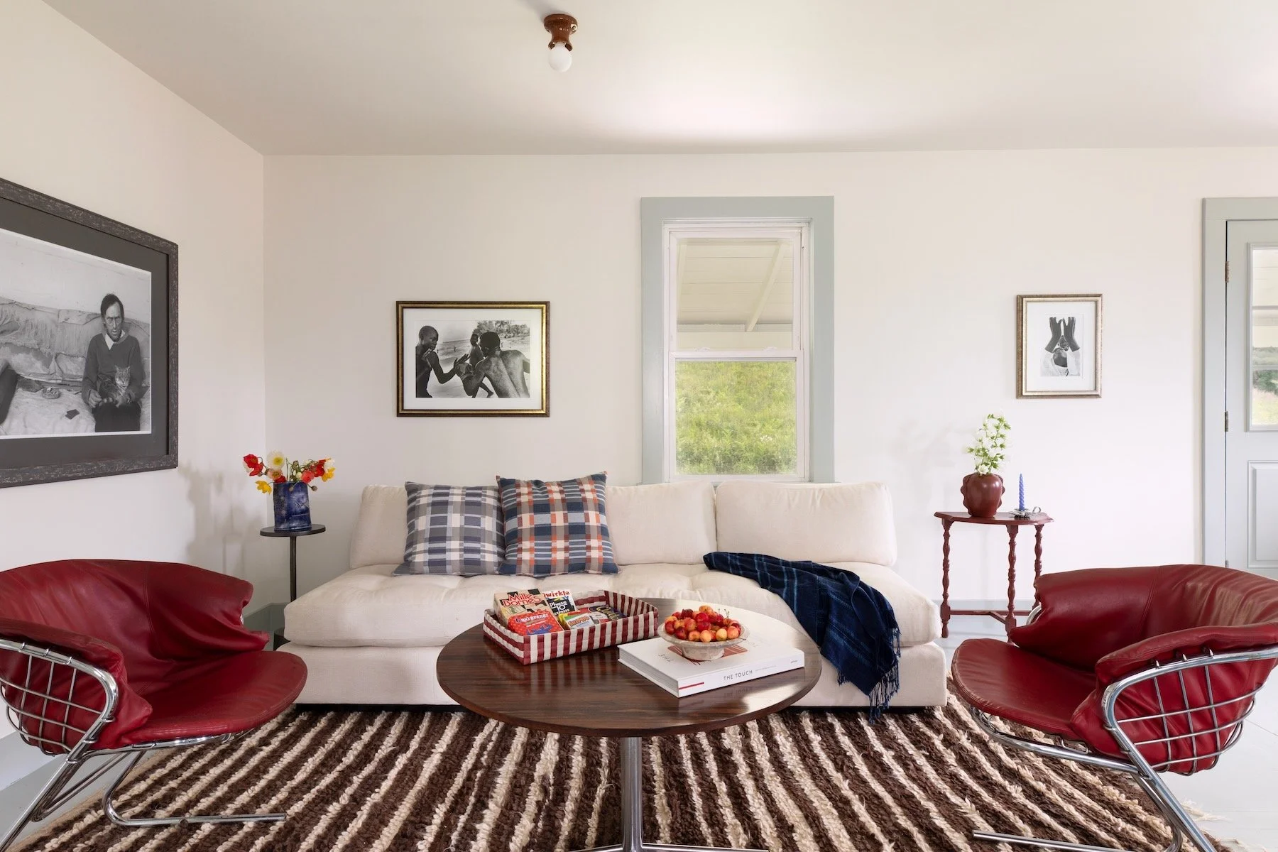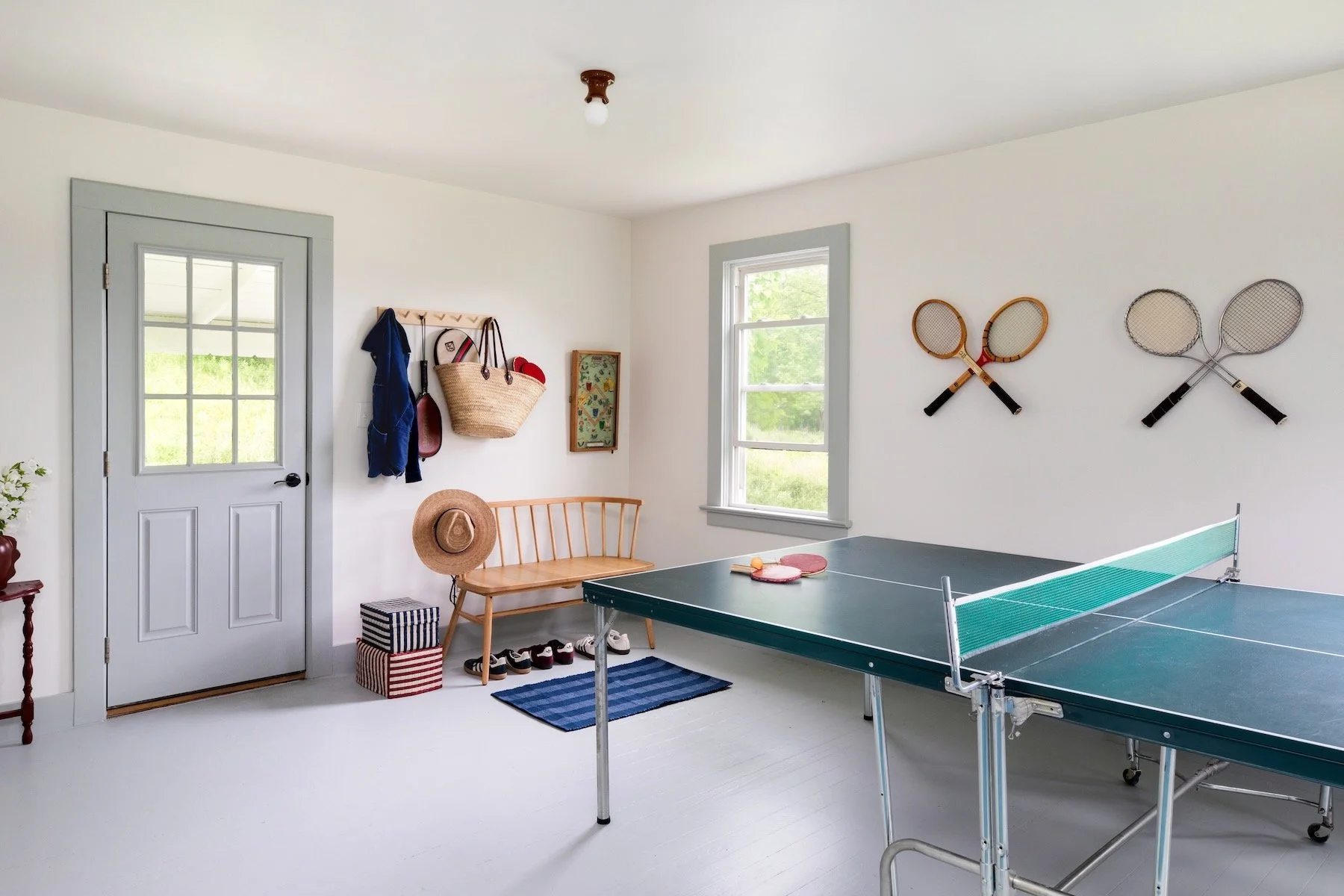 Winding up the driveway towards the property's entrance are the Playhouse and the Gatehouse. The Playhouse is a light-filled mid-century cabin featuring a large living and games space, a kitchenette, a full bath, and a separate room that serves as a gym but could easily be used as a cousins' bunk room, art studio, office, or an overflow guest space. The Gatehouse is original to the property and is currently a charming one-bedroom cottage, ideal for caretakers, staff, or guests.
