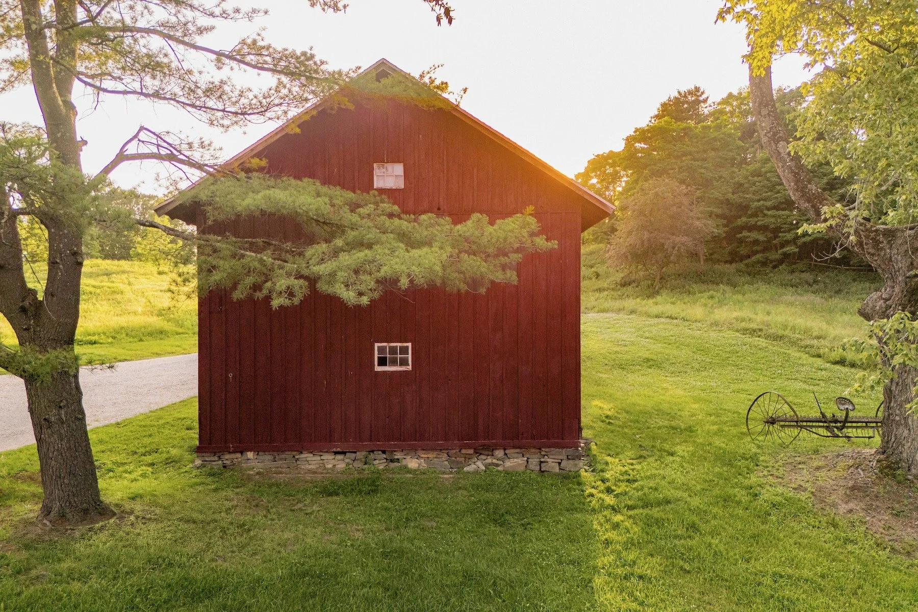 The circa 1800s barn, with a long bay currently acting as a garage, still contains much of the property's original maintenance and horse-drawn carriage equipment.
